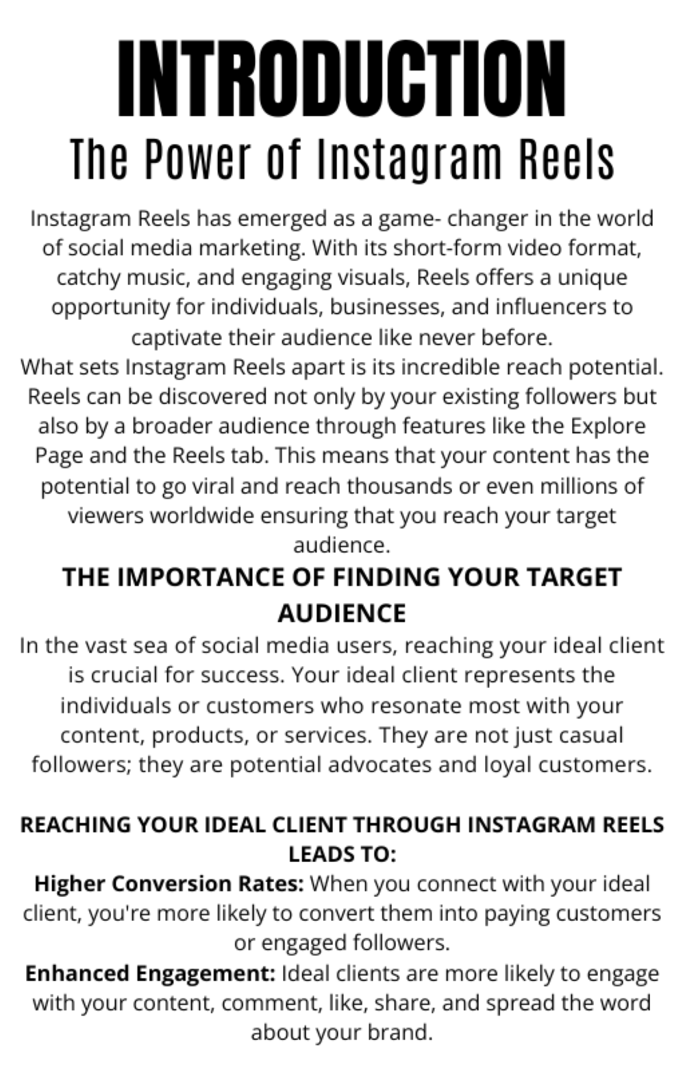 In this 15 page guide, learning how to create reels on social media offers a wide range of benefits, including increased visibility, engagement, creative expression, brand building, product showcasing, educational content delivery, traffic generation, trend participation, algorithm optimization, and staying relevant in a rapidly evolving digital landscape. Whether you're an individual looking to grow your personal brand or a business seeking to expand your online presence, mastering the art of reels can help you achieve your social media goals and connect with your audience in meaningful and impactful ways. 15 pages.