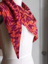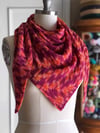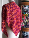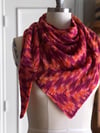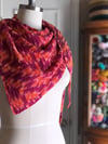 This shawl is worked side-to-side, with long chains sporadically extending the bottom edge until the full depth is achieved. At the midpoint, the extending chains cease and instead some stitches will be left unworked at the beginning of each decreasing section to bring the shawl back down to a point at the other end.