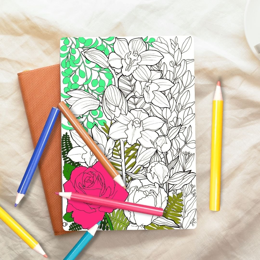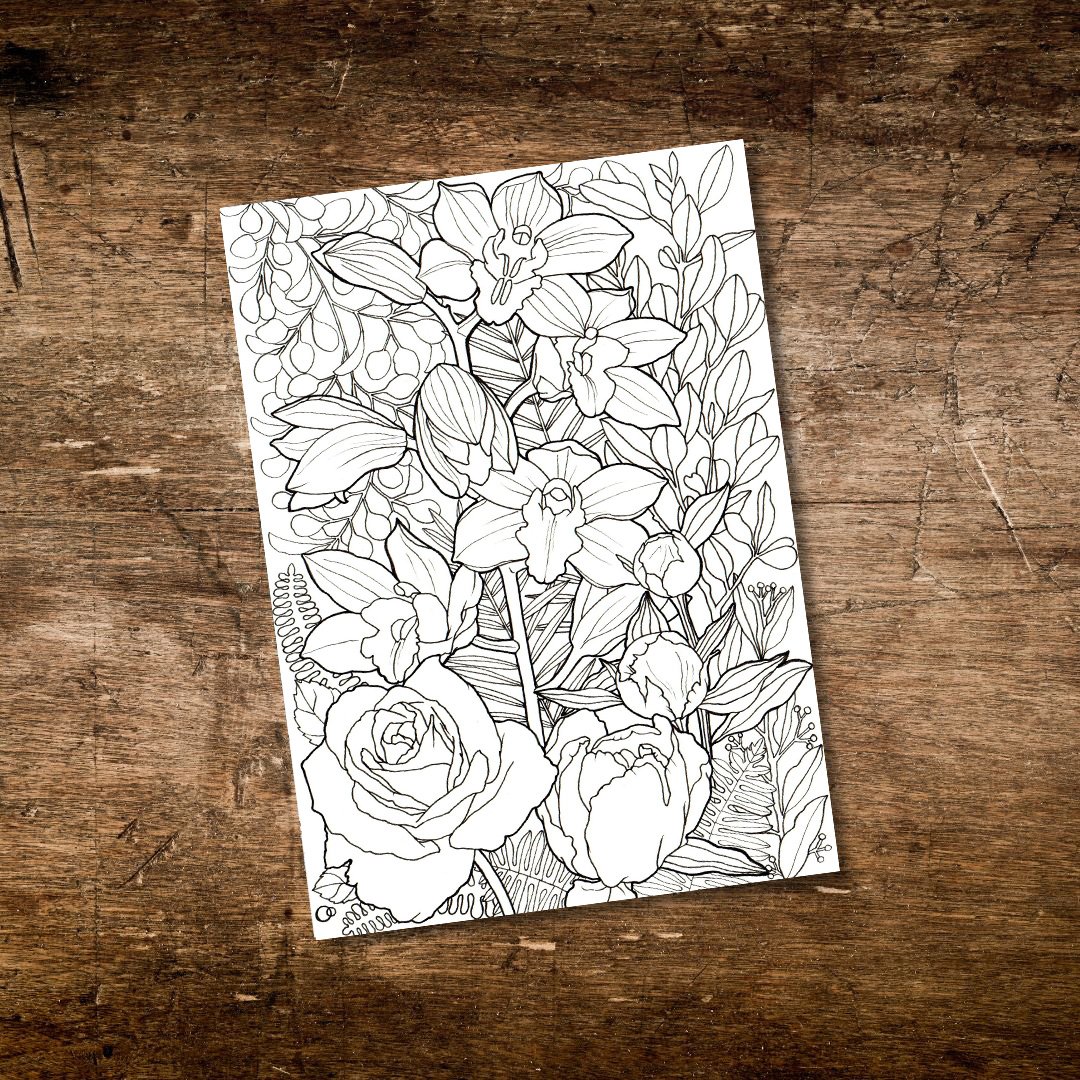 Become absorbed in creative occupation while colouring these hand-drawn adult colouring pages featuring opulent florals. This set of nature-inspired pages includes two unique designs from original ink drawings showcasing summer-blooming flowers. Each design features varied floral and foliage elements to add complexity and immersion - lose yourself colouring luxurious orchids, roses, and opulent tropical plants. Perfect for mindful relaxation, gifting, or portfolio practice.