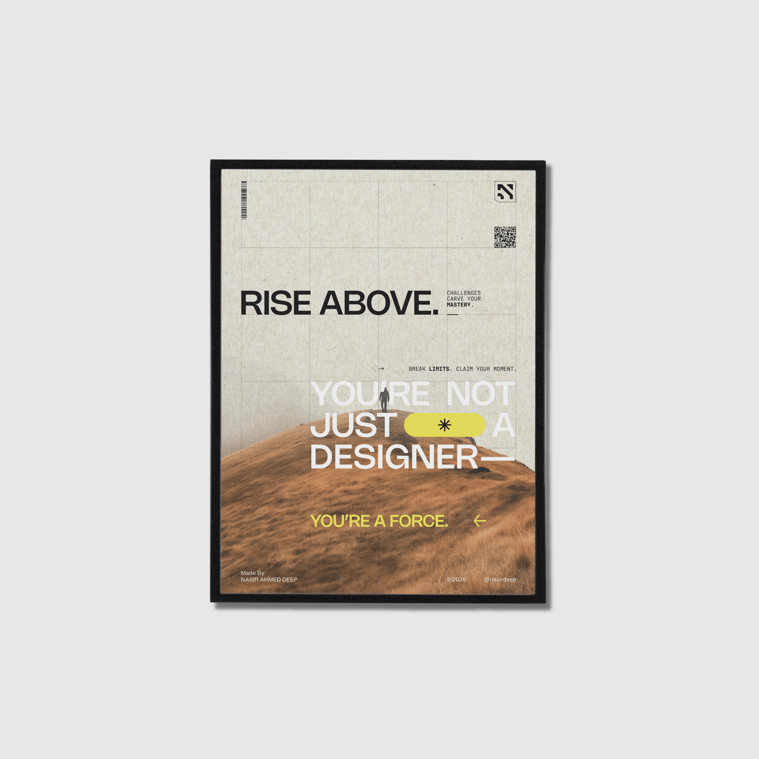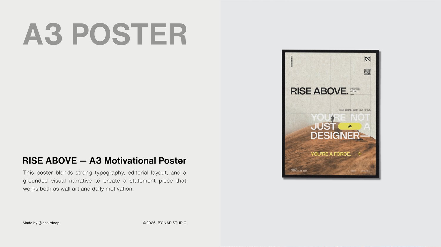 RISE ABOVE is a print-ready A3 motivational poster made for creatives, designers, and builders who believe growth comes from pressure, not comfort. This poster combines strong typography, an editorial layout, and a solid visual story to create a statement piece that acts as both wall art and daily motivation. Originally shared on Instagram. It was released after people requested a printed version.