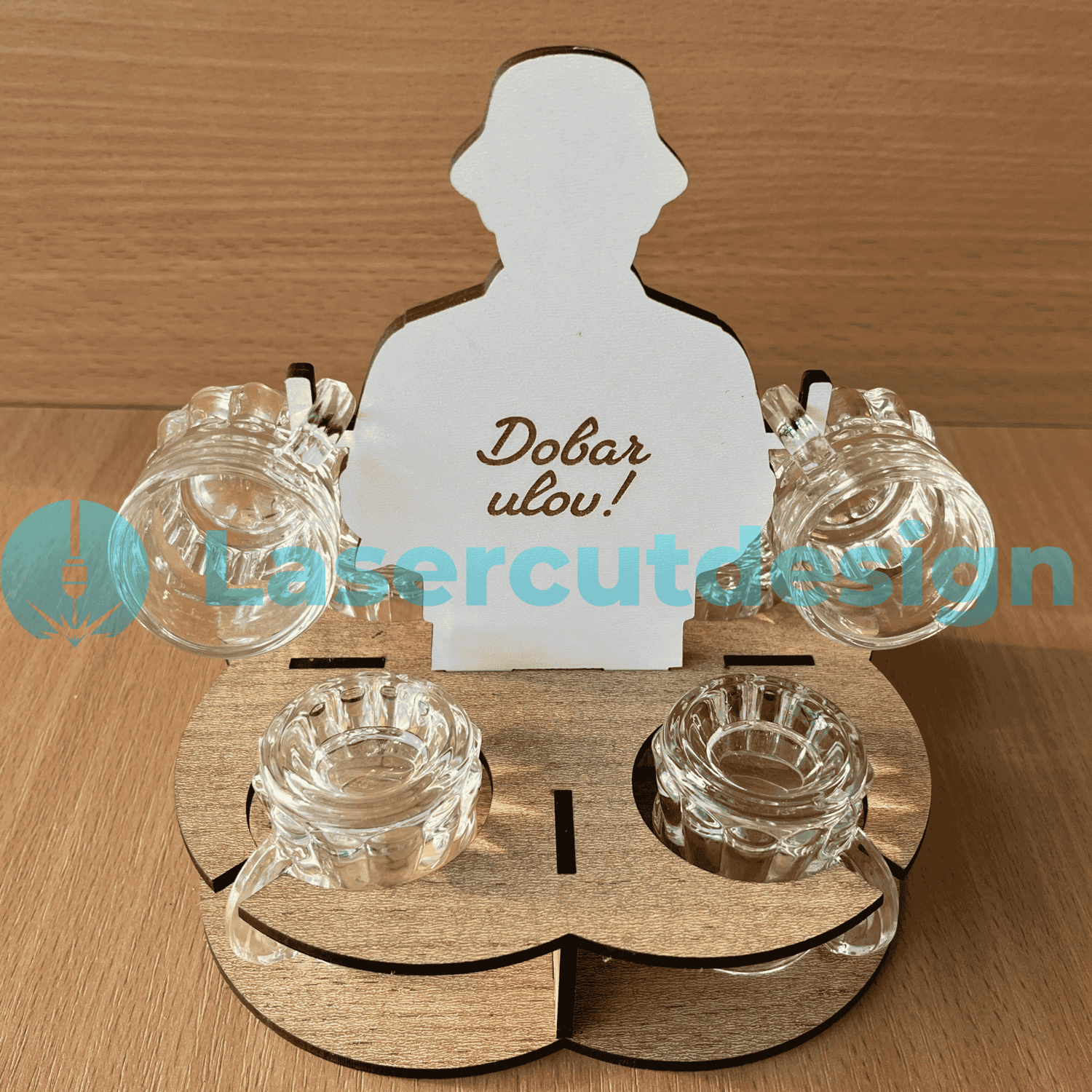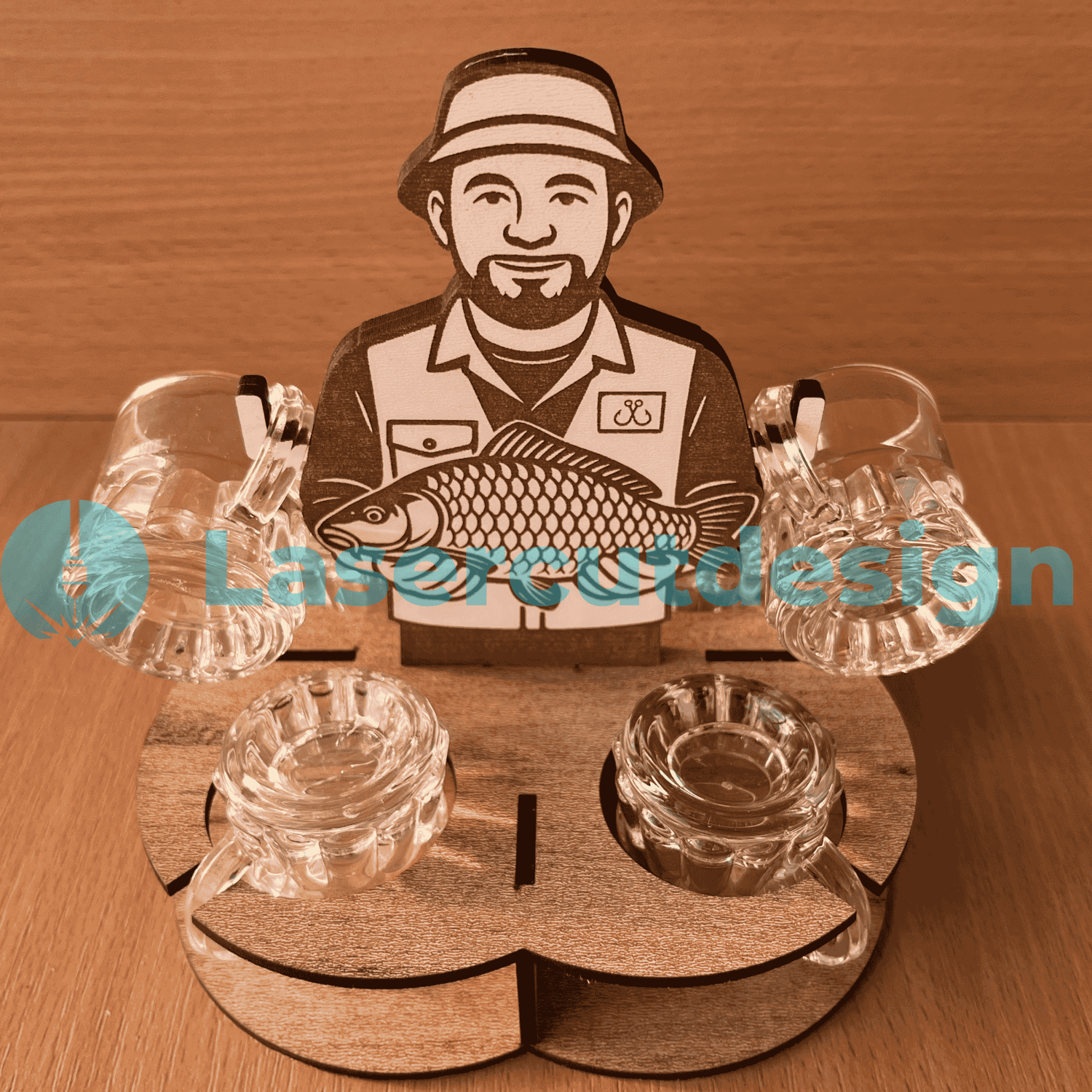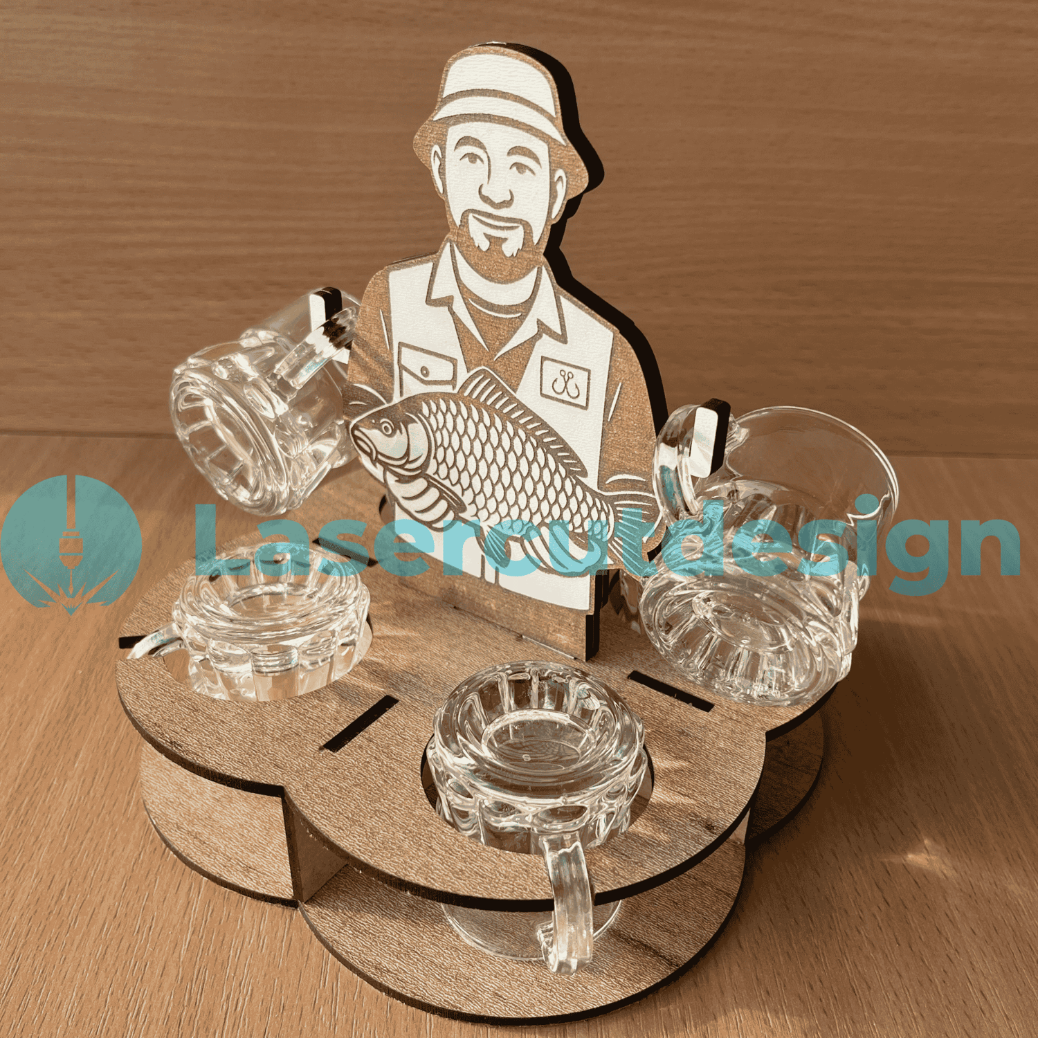Laser Cut Shot Glass Holder Fisherman with Fish | Wooden Rakija Drink Stand | SVG DXF AI Files for 3mm
