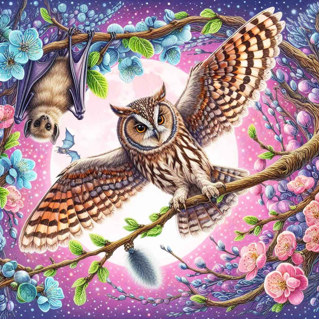 Beautiful Owl with pussy willow, bluebells & bats. Full moon with a pink background.
