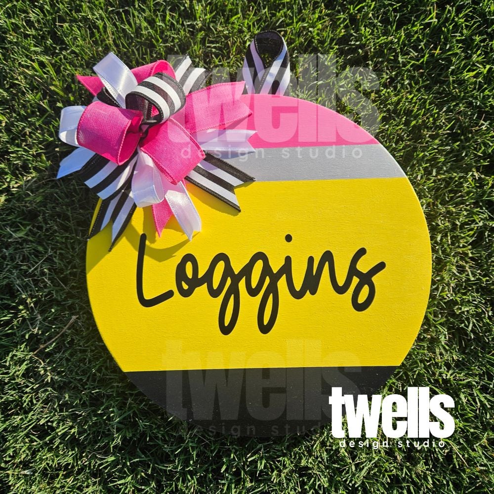 Add a bold pop of personality to your space with this handcrafted wooden door round! Featuring vibrant pink, yellow, silver, and black color blocking, a layered bow, and a personalized name, this piece is perfect for classrooms, office doors, or any welcoming space.