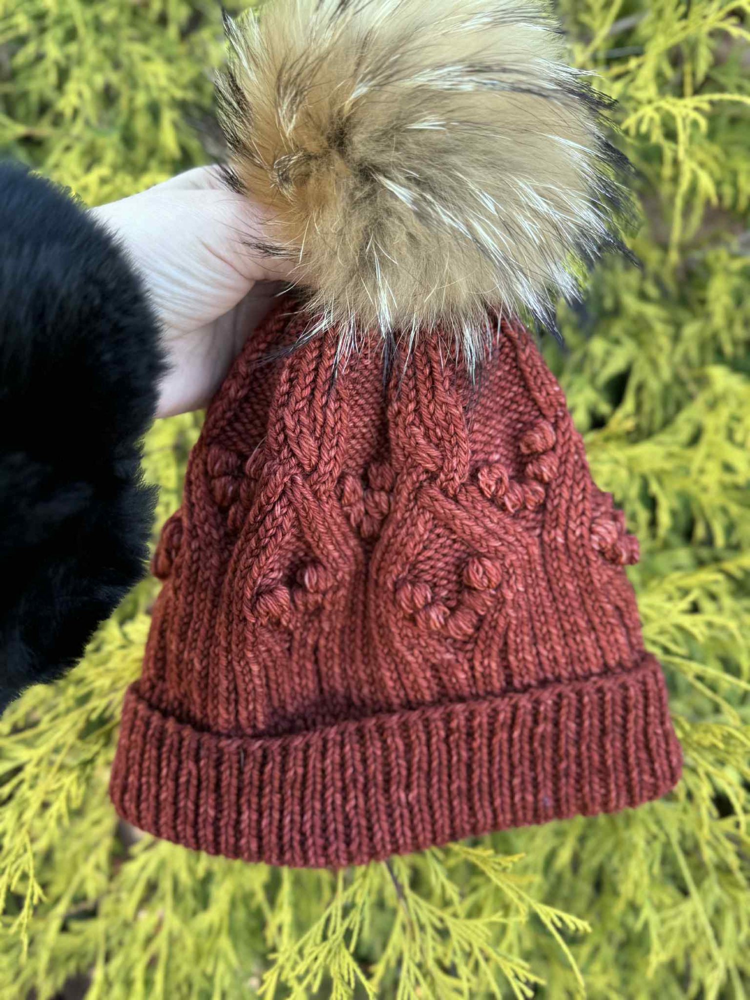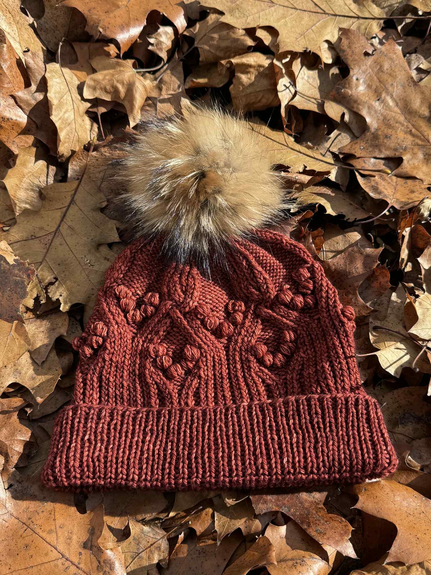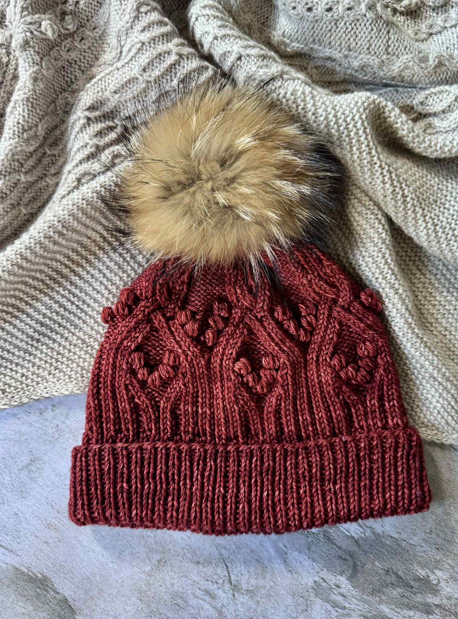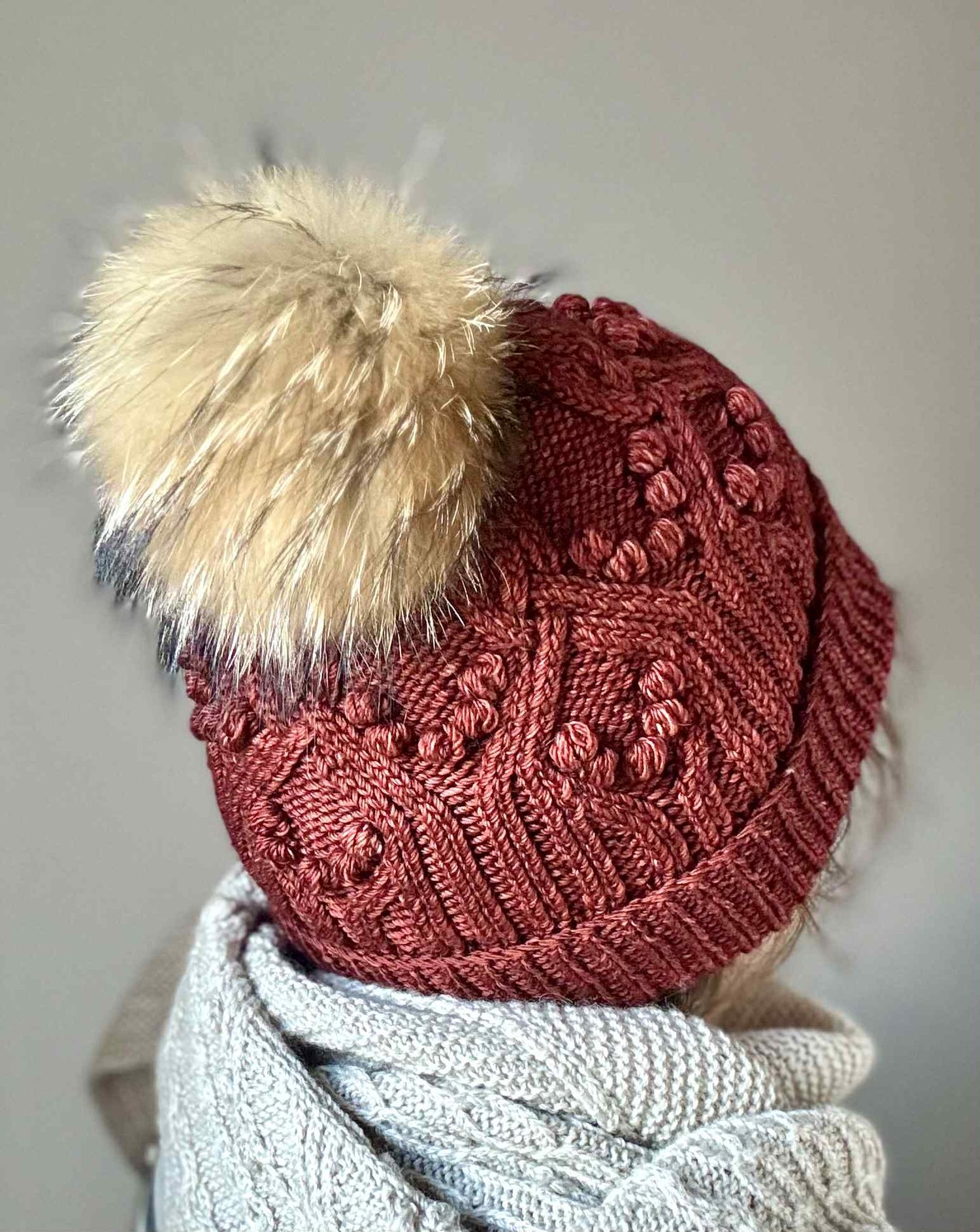 A richly textured hat featuring bobbles, cables, twisted stitches, and an intelligent ribbing that stays beautifully in place. It’s not the easiest project — you’ll need a bit of knitting experience — but it’s absolutely worth the effort. The result is a stunning, dimensional fabric full of character and charm.