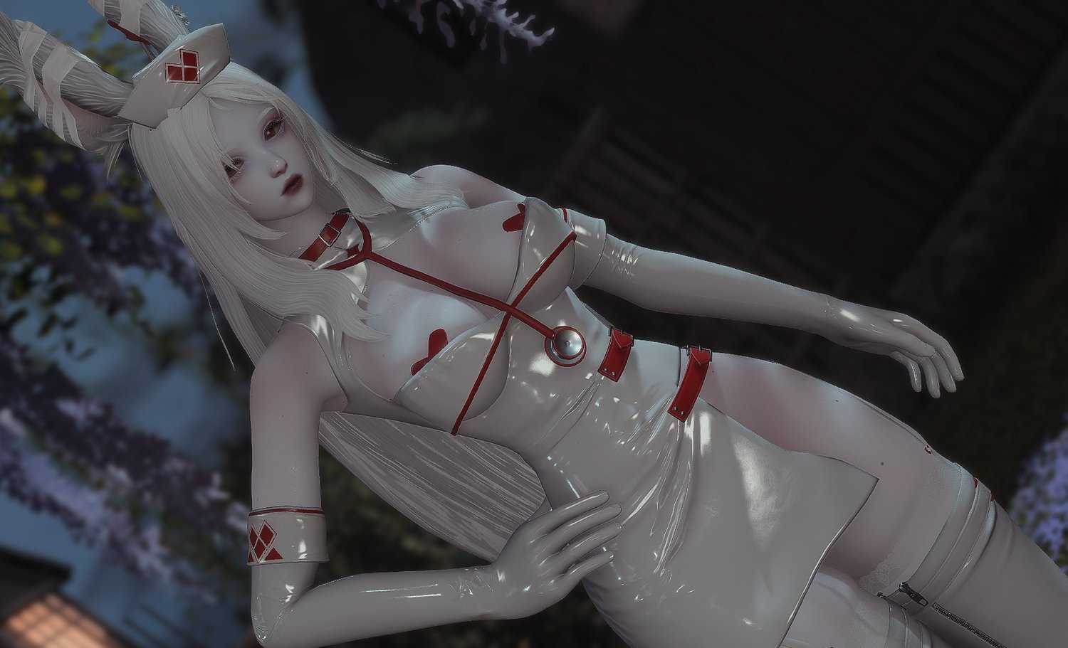 A tight, squishy latex nurse outfit. Includes a dress, high waisted panties, nipple & pussy pasties, a hat adjustable through the visor bone, gloves, stockings, boots, and a stethoscope.