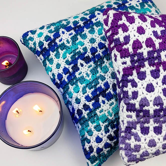 Digital chart and instructions in English (US terms) with detailed photos for creating the Snowflakes pattern in mosaic crochet. This pattern uses the overlay mosaic crochet technique.