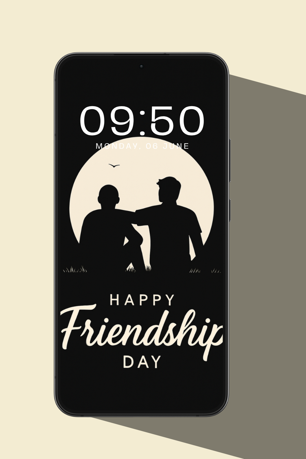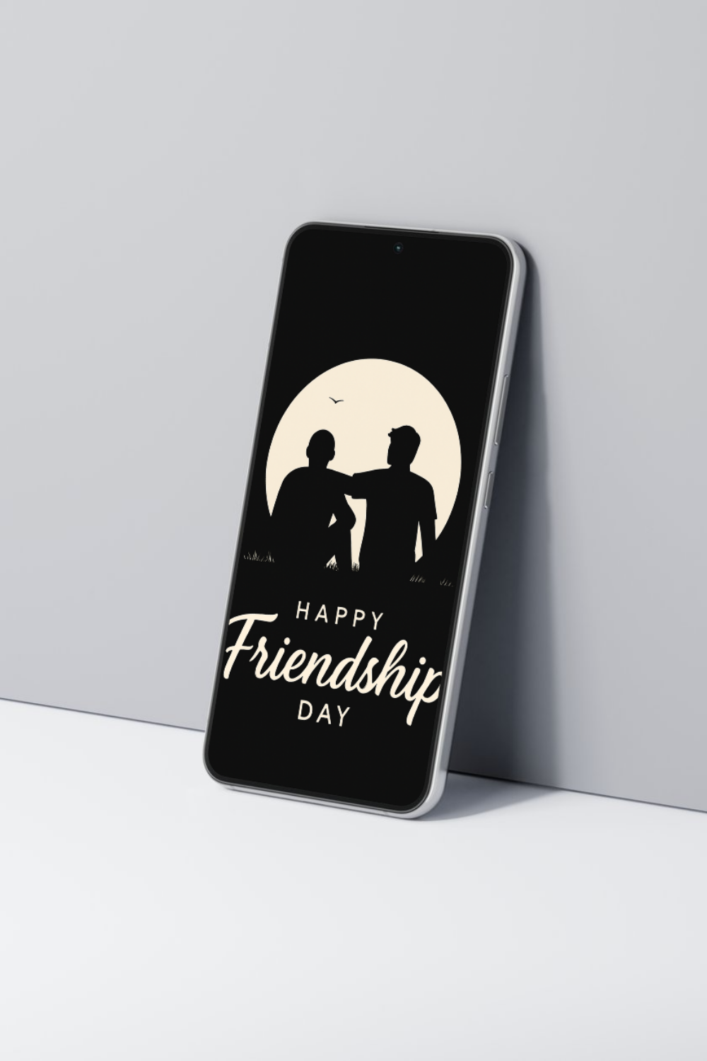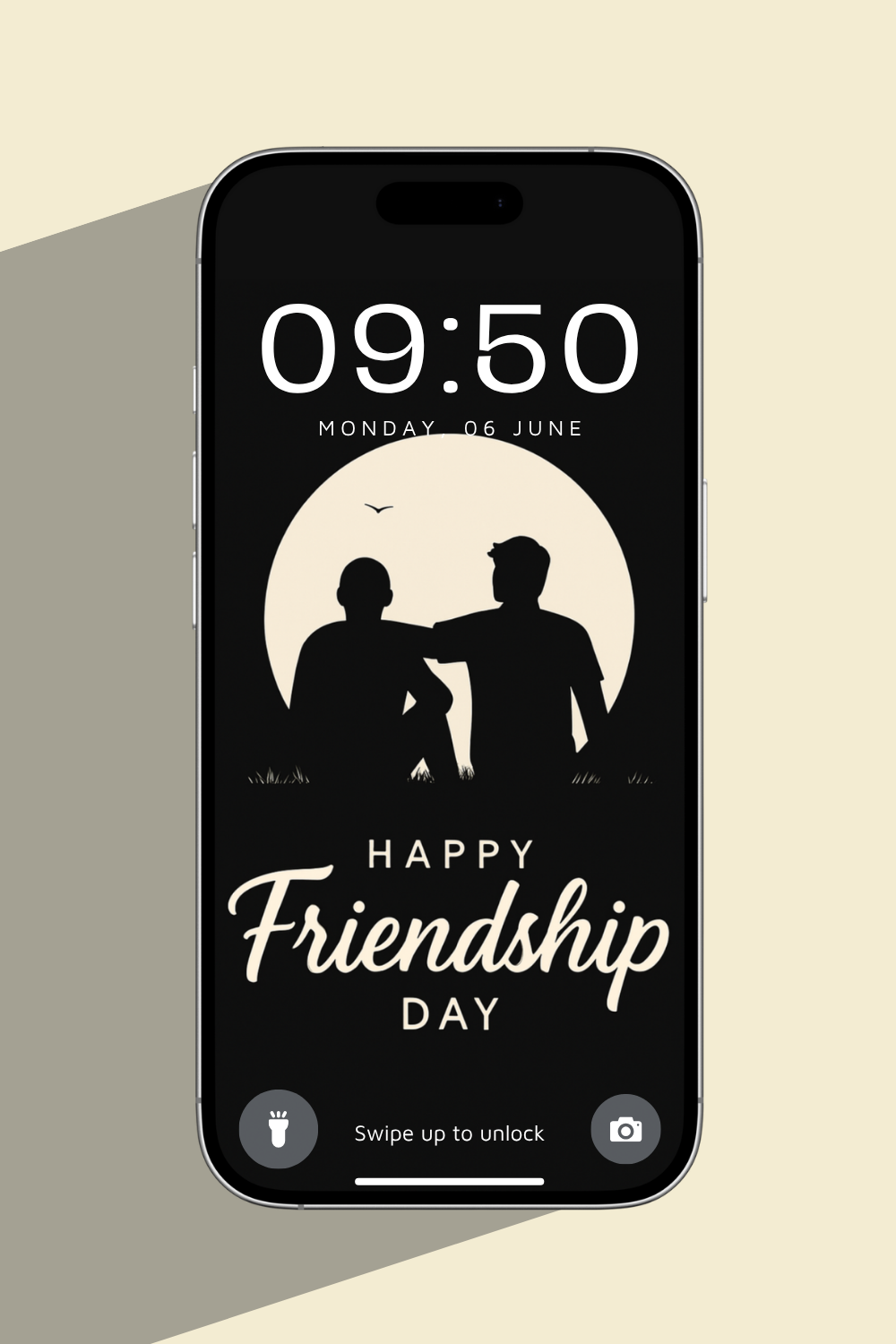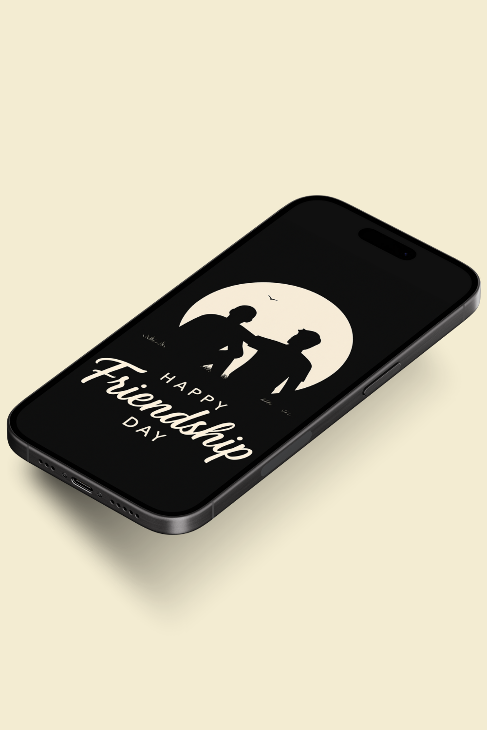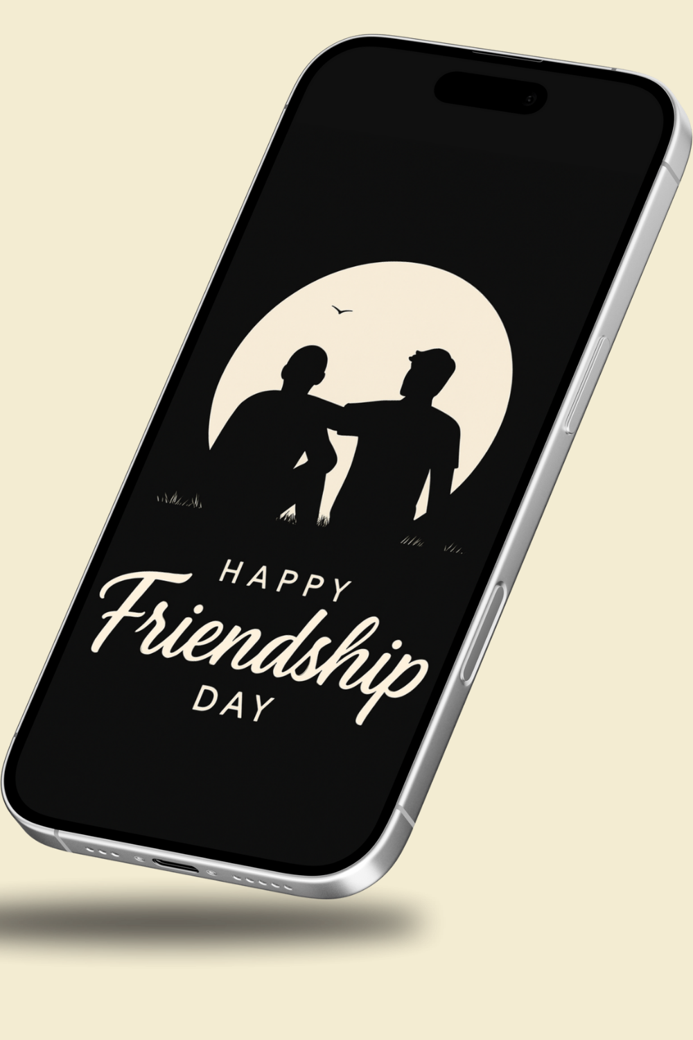 Celebrate the beauty of friendship with this minimalist Friendship Day wallpaper featuring a heartfelt silhouette of two friends sitting together under a soft moonlit glow. The design uses a bold black background with clean, elegant white typography, emphasizing the word “Friendship” in a stylish cursive font for a modern, emotional touch. Perfect for Friendship Day Instagram stories, WhatsApp status, lock screens, or sharing with your best friends!