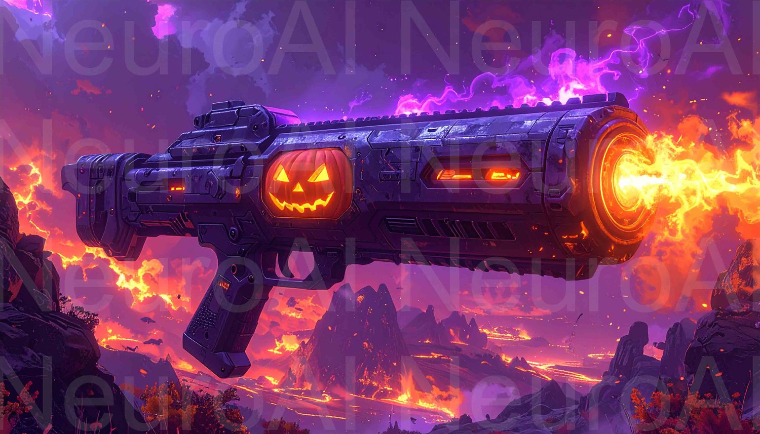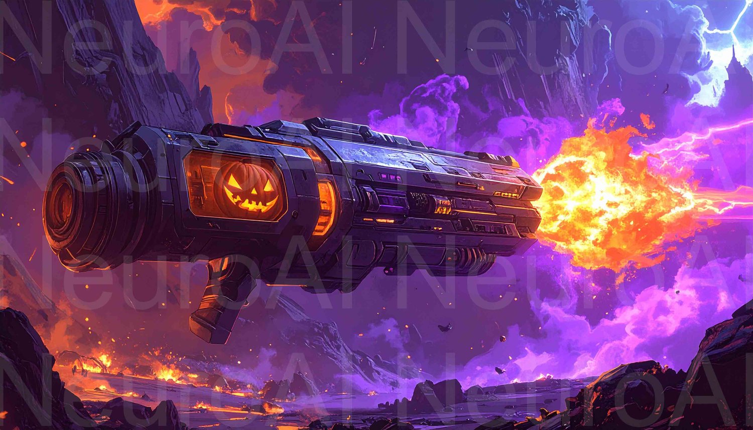 Spooky Halloween pumpkin weapon firing fiery blast sky
