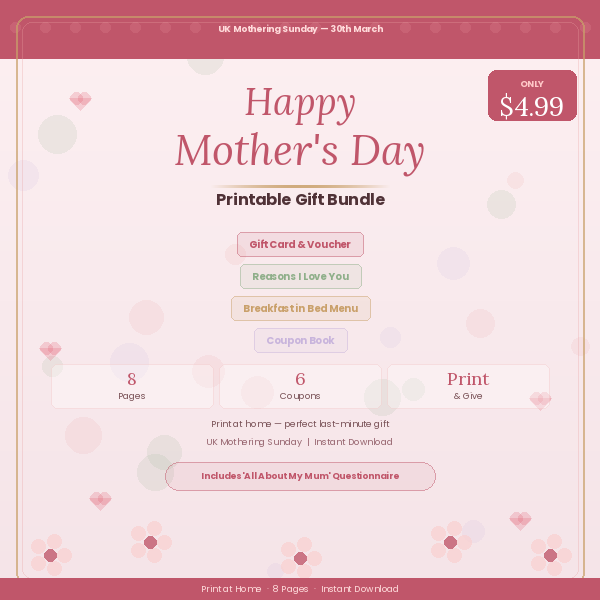 This printable bundle is everything you need to make Mum feel truly special this Mothering Sunday — without spending a fortune or waiting for delivery.
