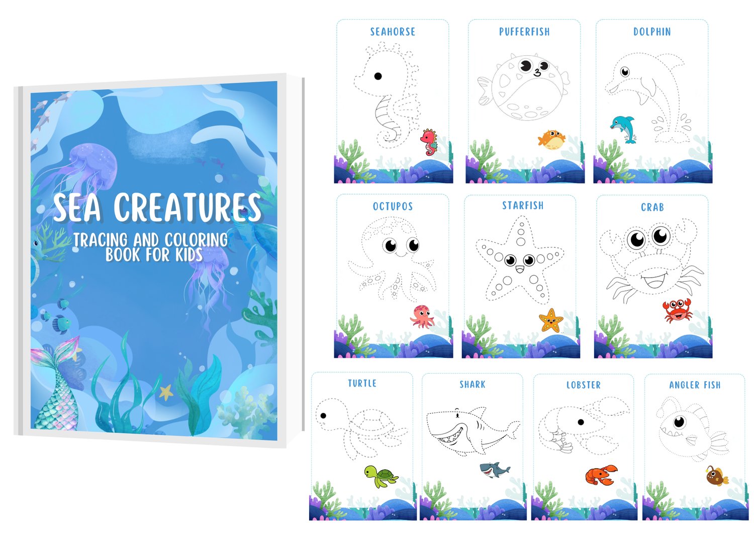 - 🐠 Sea Creatures Tracing Book – Kids can trace cute ocean animals like turtles, dolphins, and sharks while improving their pencil control.
