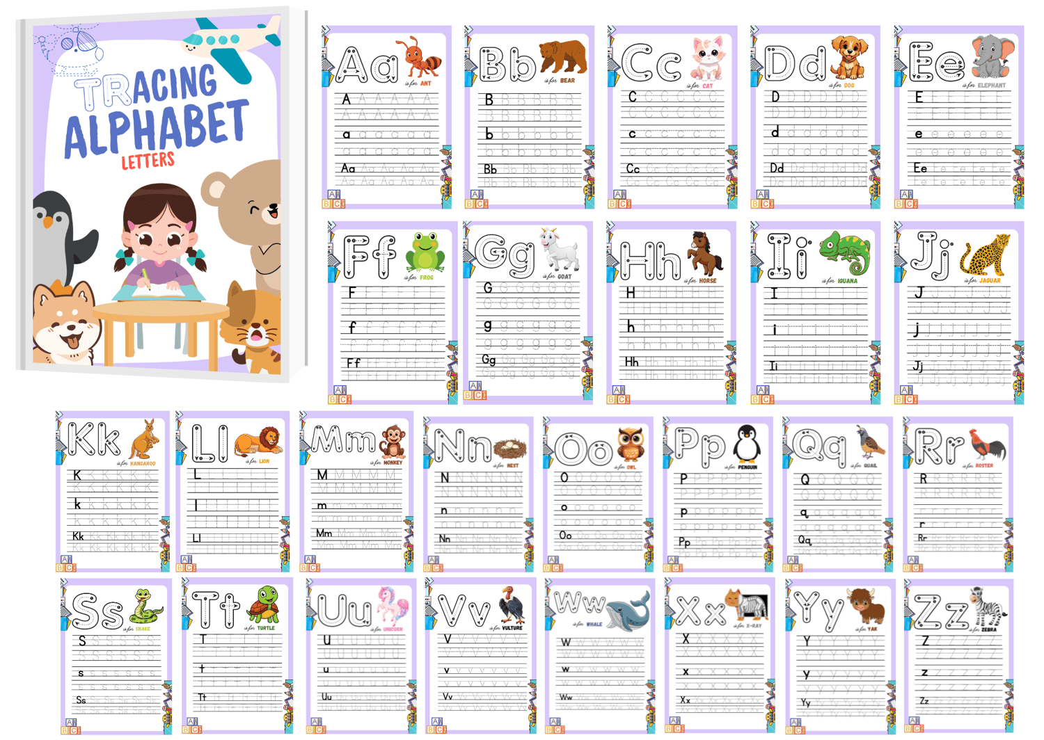 - 🔤 Alphabet Tracing Book – A to Z tracing with guided arrows for both uppercase and lowercase letters.