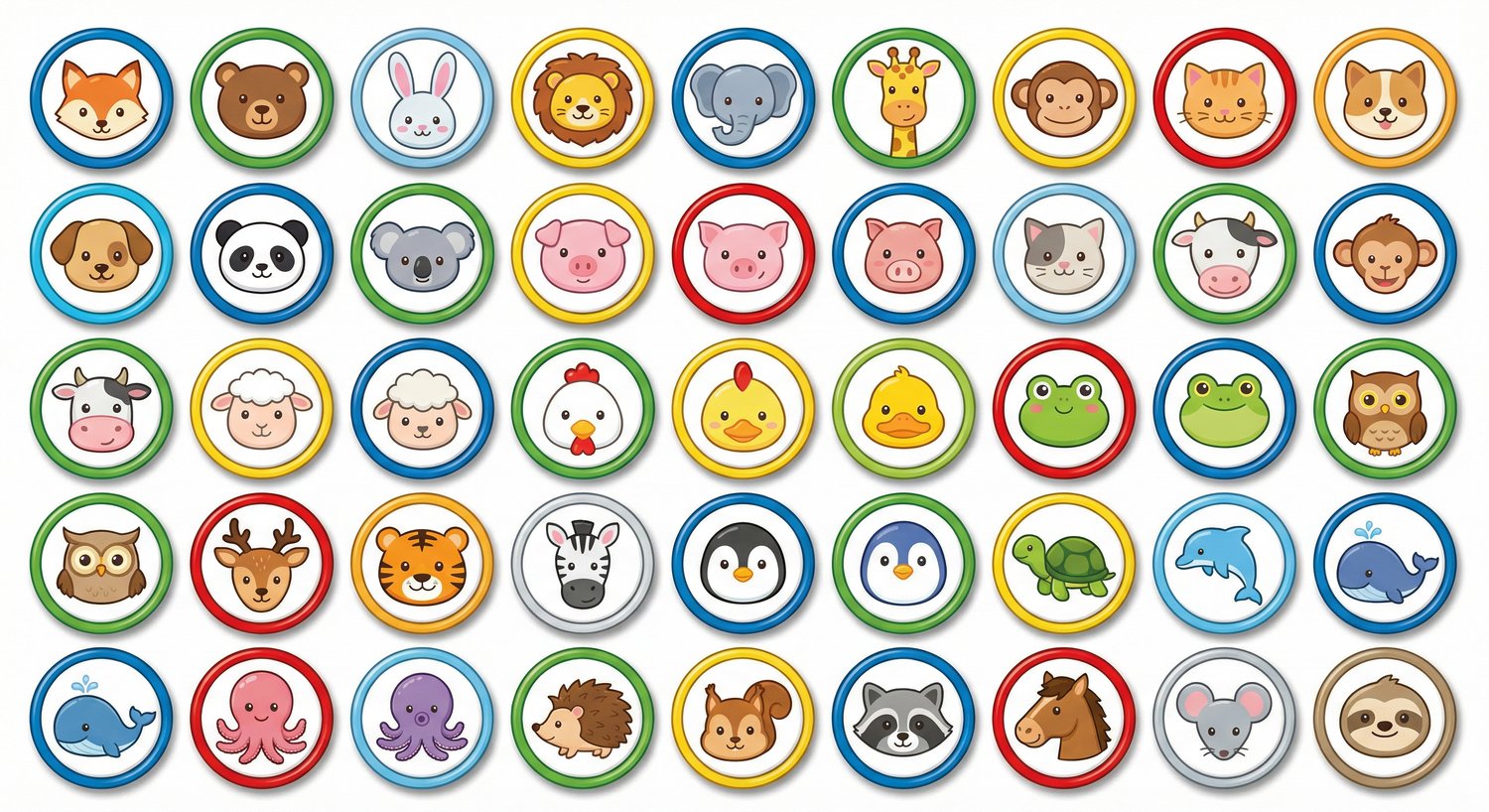 The collection includes around 45 adorable animals such as bears, pandas, bunnies, cats, dogs, lions, tigers, and more — all created with rounded shapes and friendly expressions to appeal to children.
