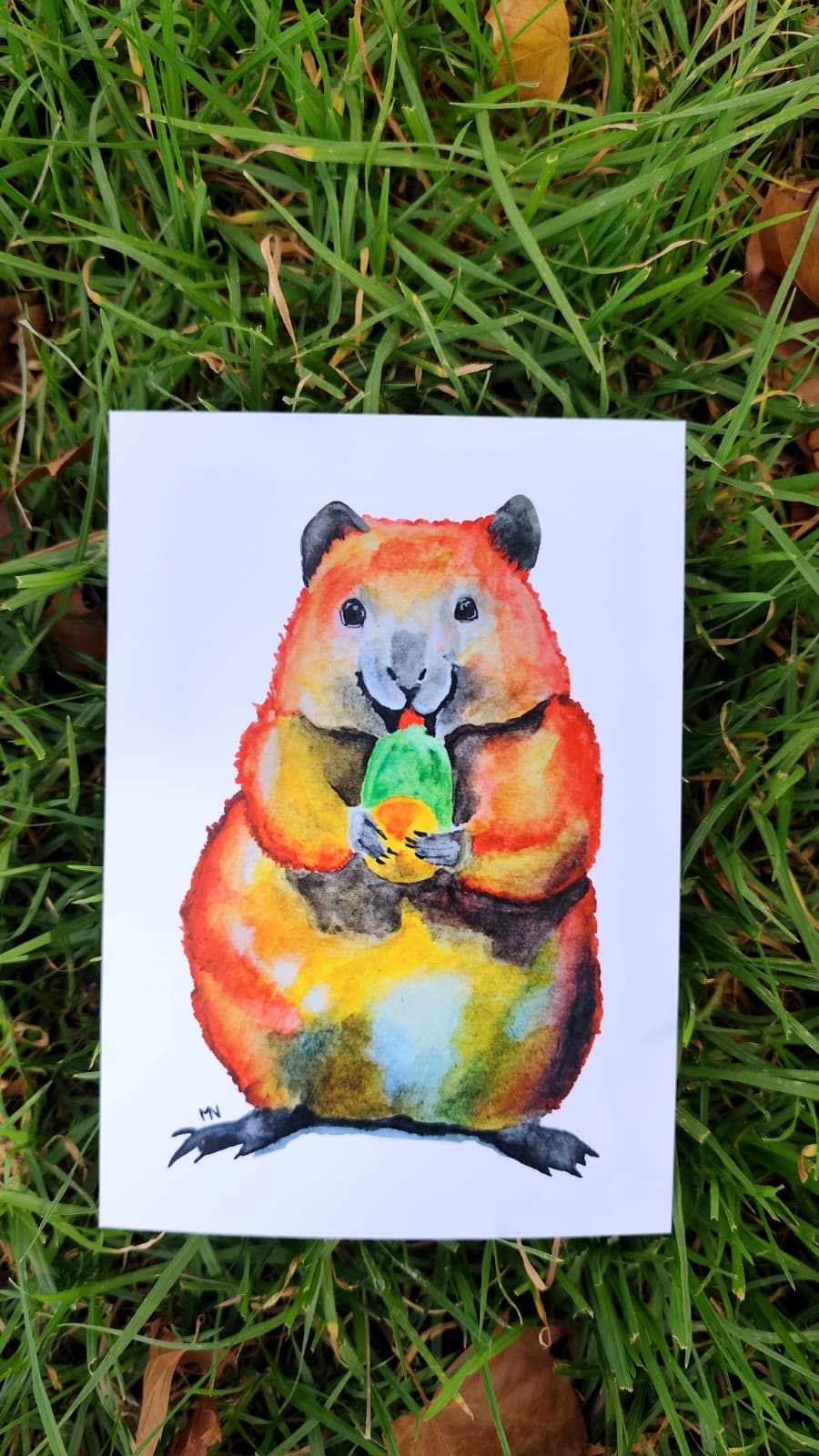 Lámina realizada totalmente en acuarela que captura la ternura del quokka, uno de los animales más adorables del mundo. La ilustración muestra al quokka comiendo una baya, con sus pequeñas manitas sosteniéndola mientras se alimenta, un gesto que refleja su carácter dulce y juguetón.