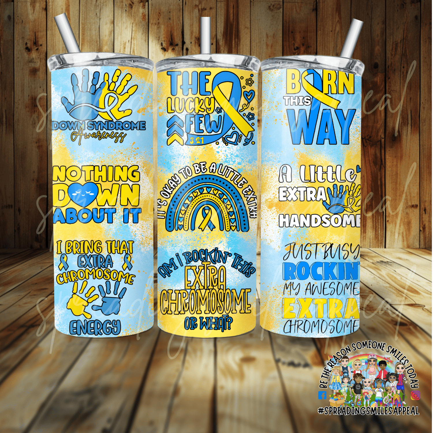 BLUE AND YELLOW QUOTE DOWN SYNDROME AWARENESS TUMBLER