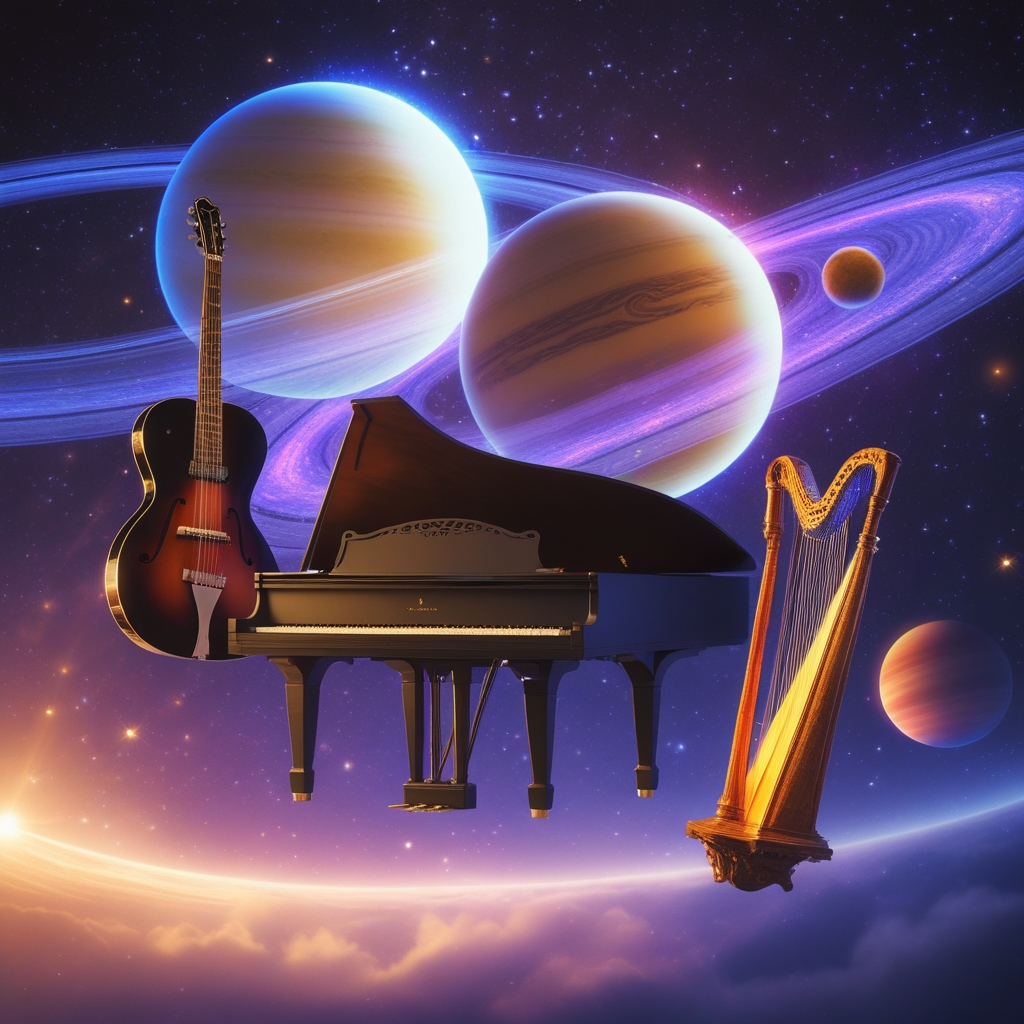Render a stunning, ethereal scene featuring a variety of music instruments suspended in mid-air, set against a breathtaking celestial backdrop of vibrant, glowing planets, their rings and atmospheres luminous in shades of blue, purple, and gold, with a warm, soft light illuminating the instruments, including a grand piano, a sleek electric guitar, a vintage trumpet, a majestic harp, and a few more, each with intricate details and textures, while the planets, ranging in size and distance, display distinct characteristics, such as Saturn's prominent ring system, Neptune's icy blue hue, and a smaller, rocky planet in the foreground, with subtle, shimmering starlight adding depth and magic to the overall composition.