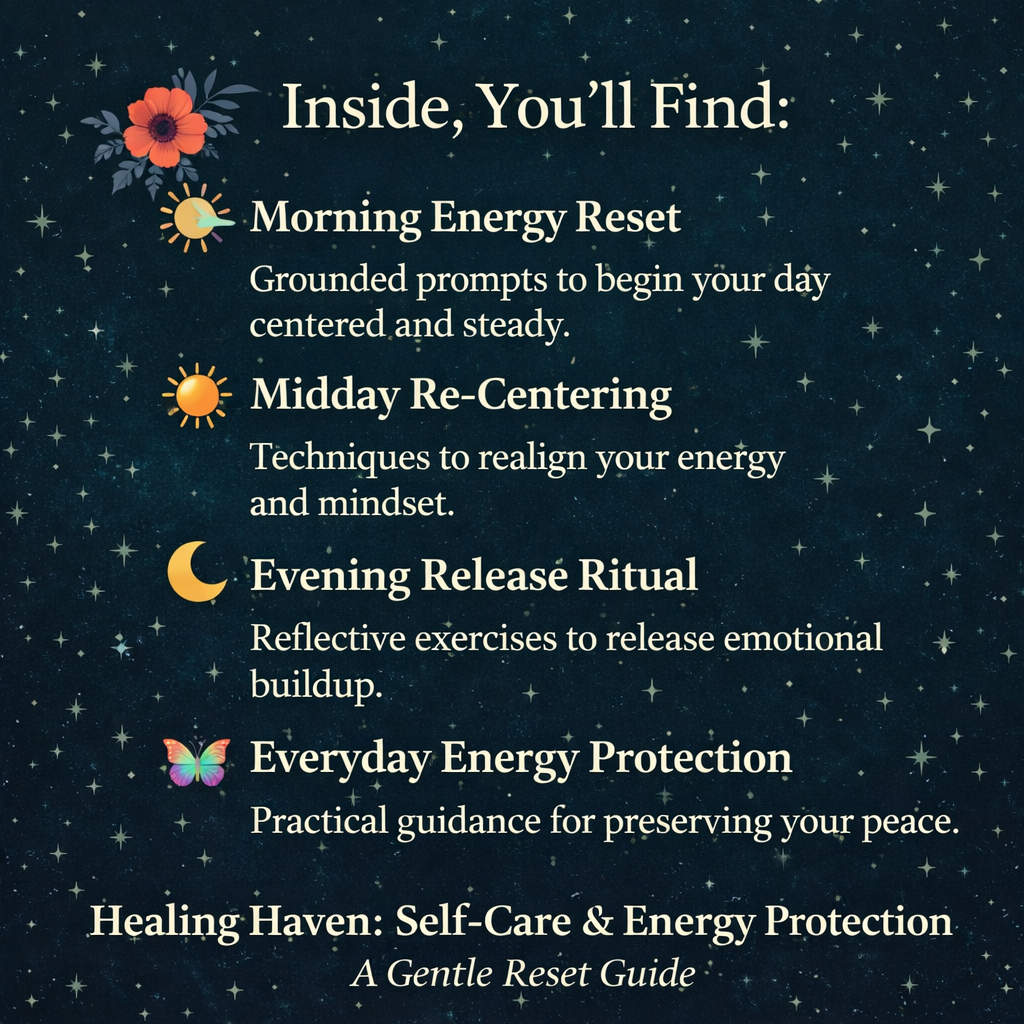 The Healing Haven Self-Care & Energy Protection Guide is a gentle reset tool designed to help you reconnect with your peace, restore emotional balance, and protect your energy from the noise of daily life.