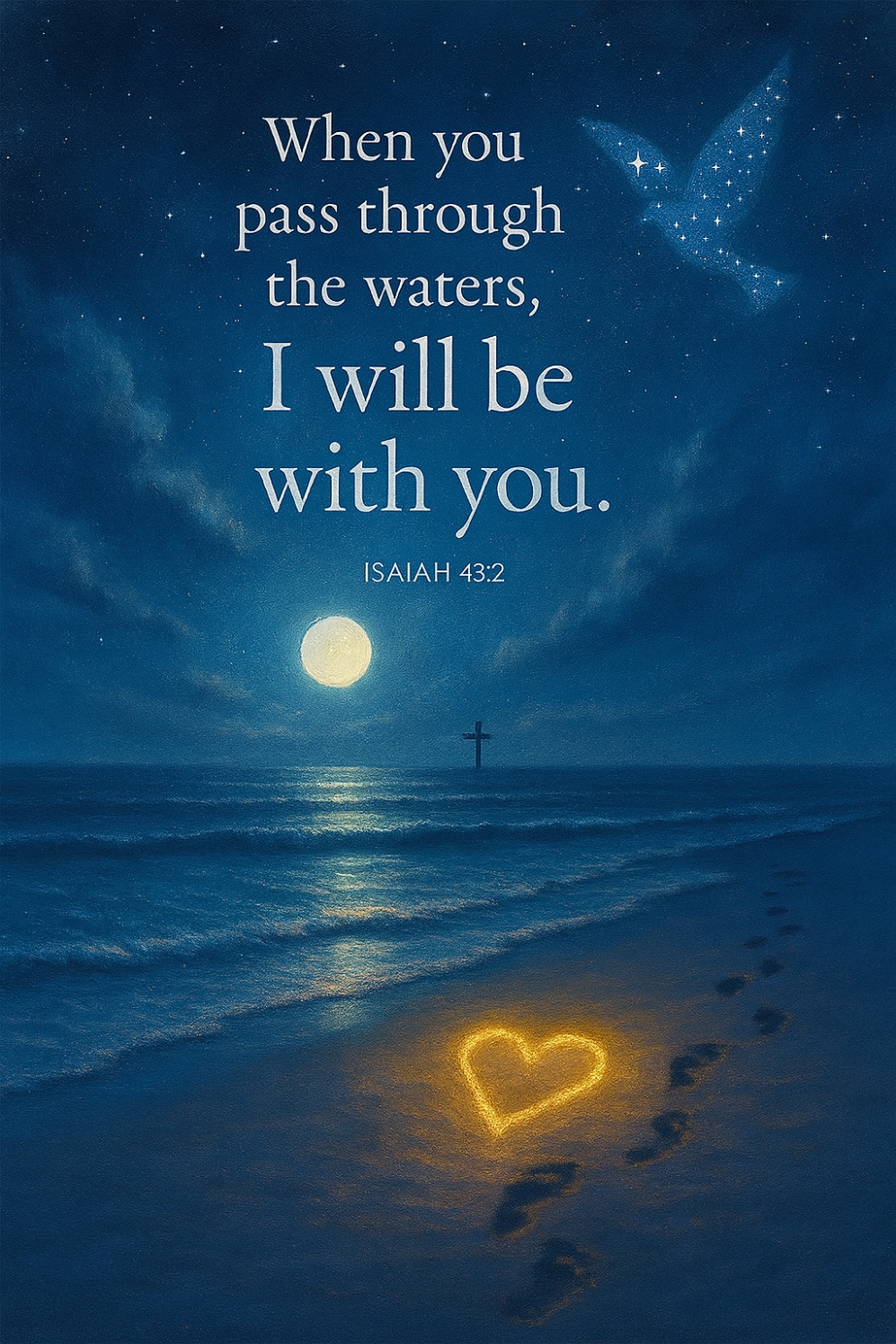 🌊🕊️ Christian Scripture Wall Art – Isaiah 43:2 Moonlit Beach Poster – Faith-Based Printable for Devotion, Homeschool & Ministry – Divine Presence Theme