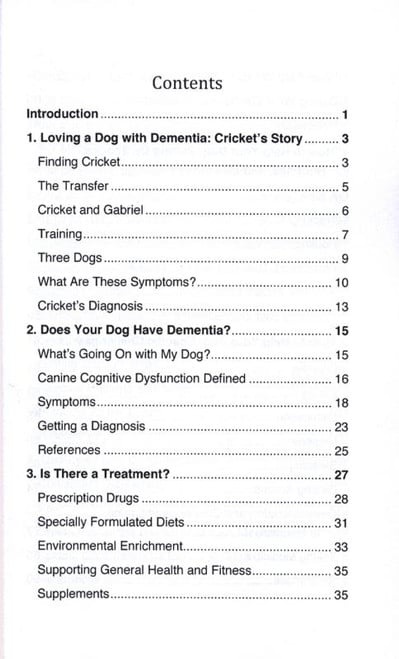 The story of Anderson's small terrier Cricket, who developed dementia, is threaded through the book. As Cricket's dementia worsened she paced, she circled, she stood in corners, she forgot what she was doing, and at times she lost and found her owner repeatedly. For the last weeks of her life she even forgot how to drink water. As Cricket's condition deteriorated and needs changed, Anderson learned about the disease and developed methods to care for her dog.