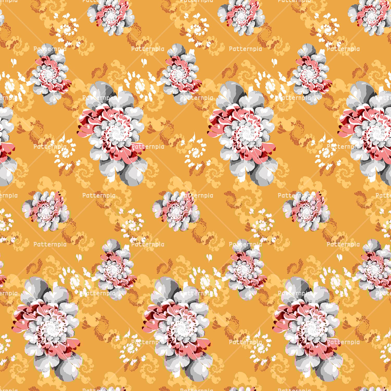 Elaborate spiral floral motifs on a vibrant marigold yellow ground.