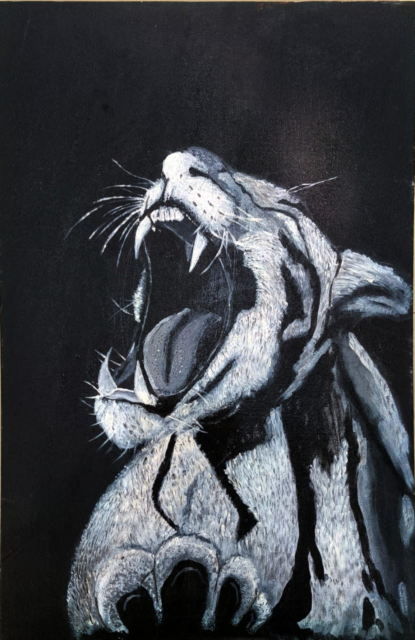 The stark black canvas serves as the night sky to the fierce creature's piercing cry, a visual metaphor for the struggle against the shackles of the mundane. The icy whites and cool grays slice through the darkness, manifesting the artist's inner turmoil and desperate desire for release.