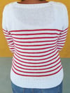 I was inspired to design this sweater while watching an episode of the hilarious TV series Grace and Frankie. Jane Fonda was wearing a beautiful striped sweater with some details on the front neck accompanied by an interesting button placement. I immediately knew I wanted a sweater like that and I hope you will too! The Grace and Frankie Sweater is knitted flat in pieces and then seamed together, circular needles are only used to accommodate the number of stitches. You knit from the bottom up the Back, the Front and the Saddle Shoulder Sleeves. You will then sew the saddle straps to the shoulders and knit the neckband in two stages. Then set in the sleeves and sew underarm and sleeve seams. The last touch is sewing the buttons in place…and you’re done!