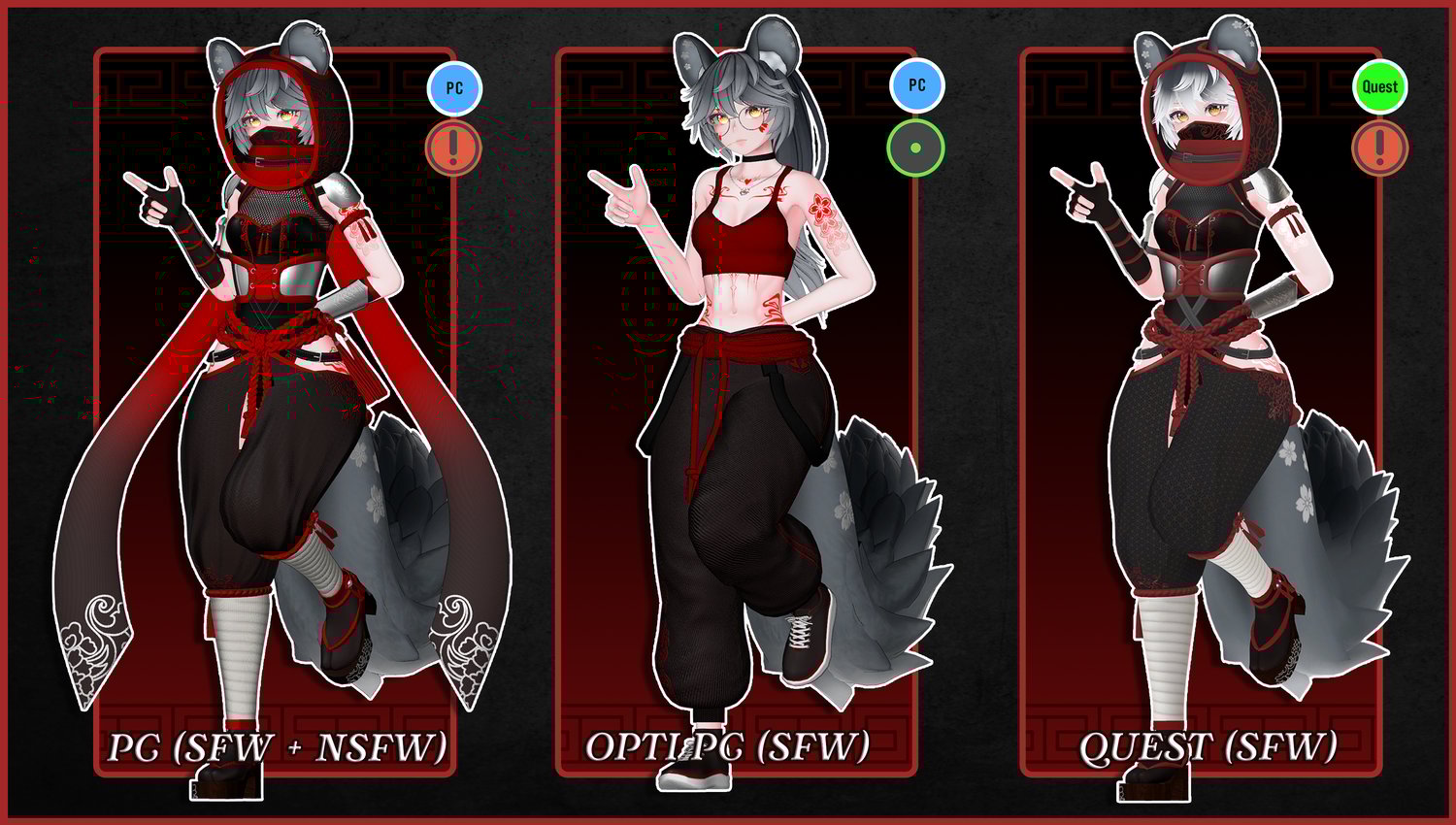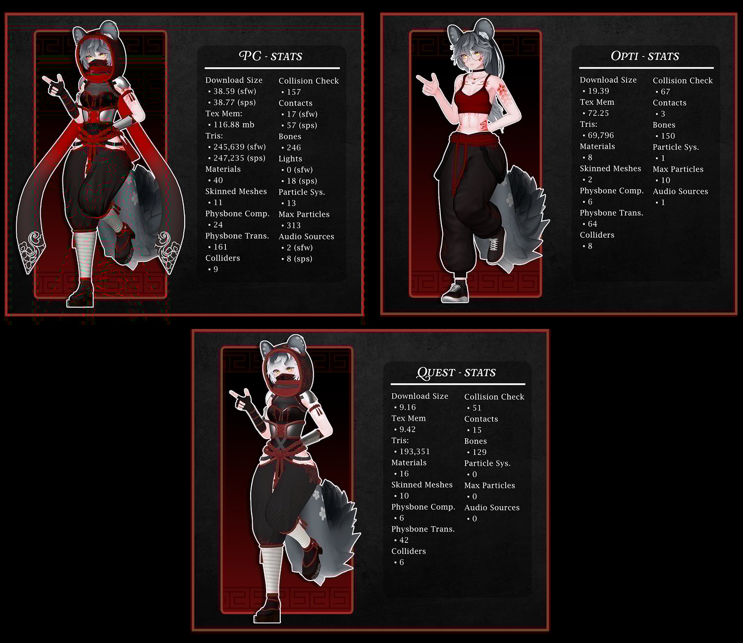 - The quest version uses the newest quest shader to allow more color customization! It also comes with all the props save for the bomb (invisibilty is impossible for quest). The Quest version is cross compatible with PC versions and comes set up for you with instructions! (For now, this does not include the opti pc version)