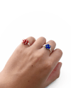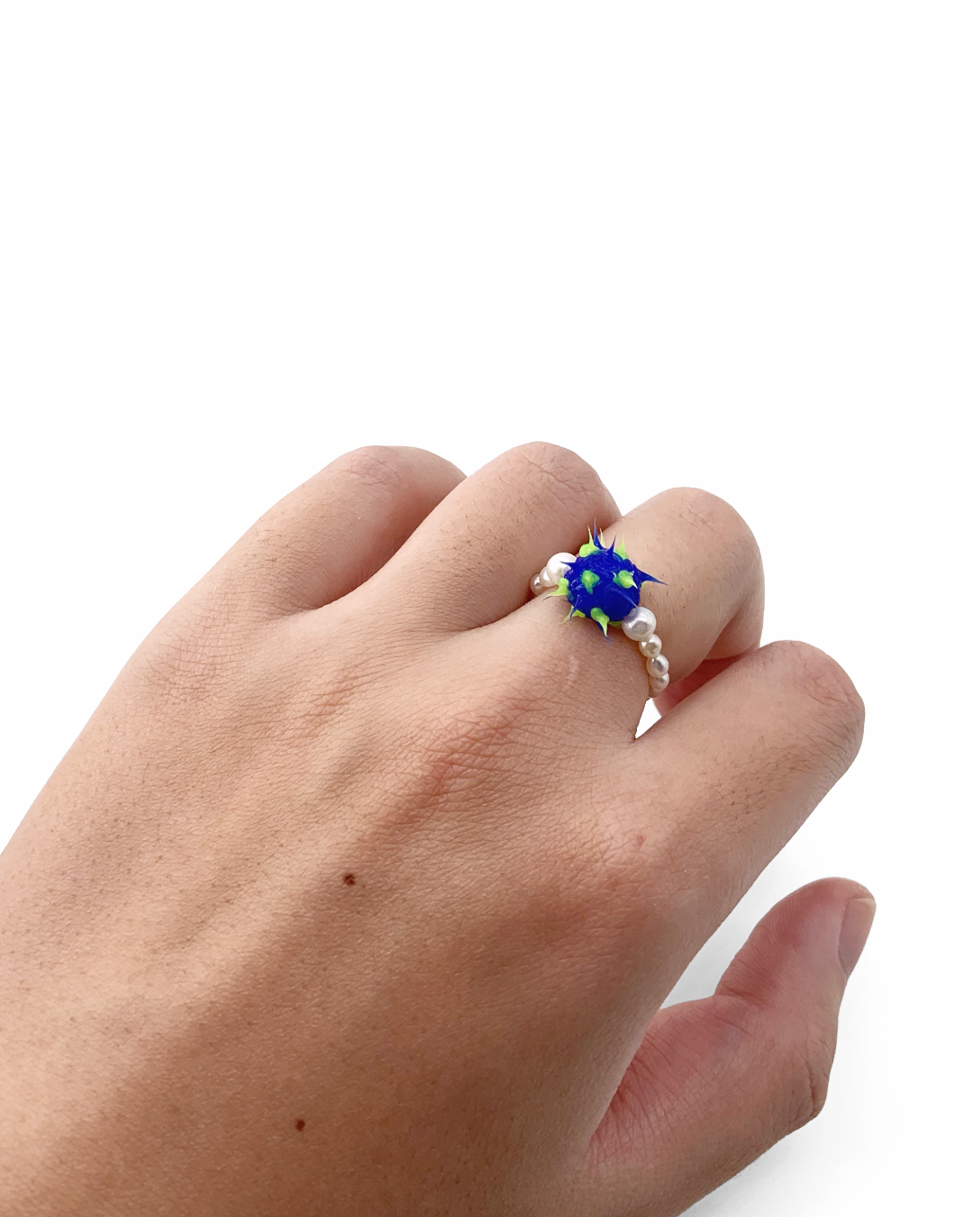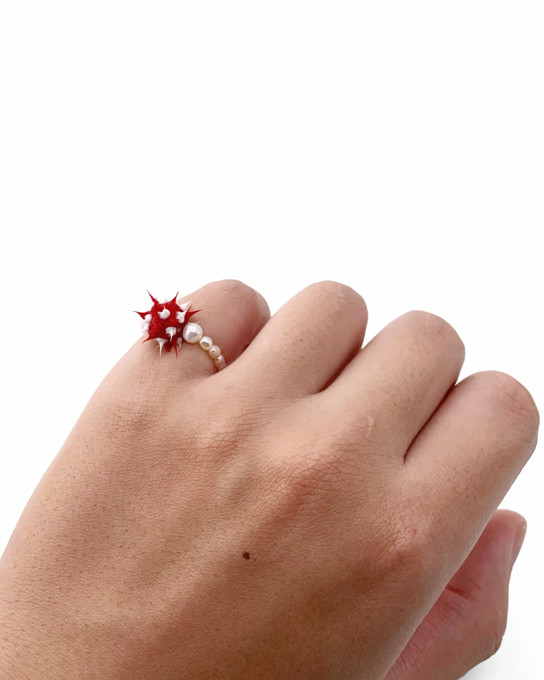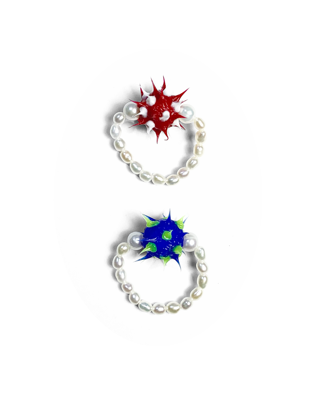 在橡膠主體左右各加入一顆圓形珍珠,正面視角呈現由大至小的節奏,讓造型在張力之中維持視覺平衡。