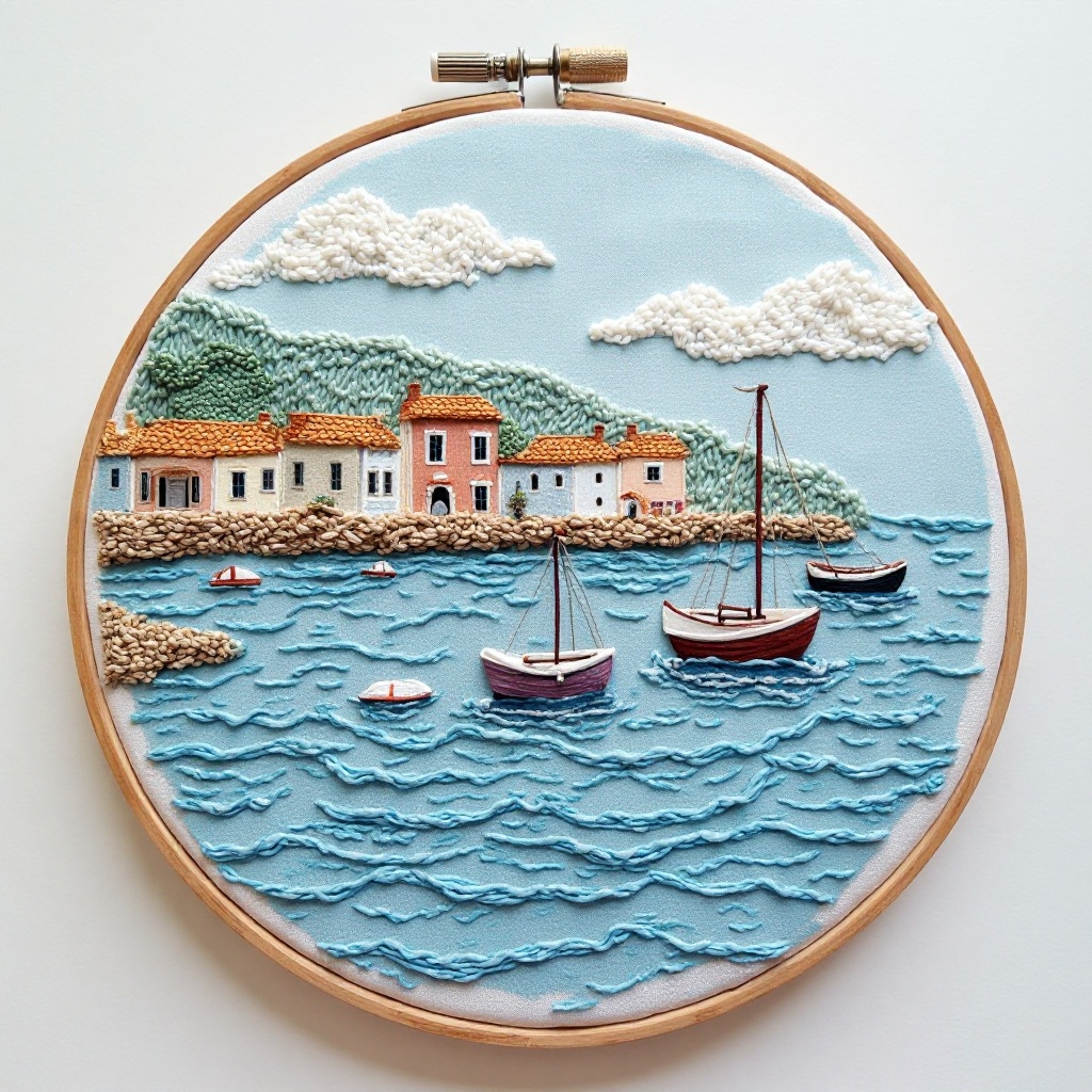 - The Coastal Breeze: Calming sea views rendered in delicate blue threads.