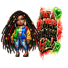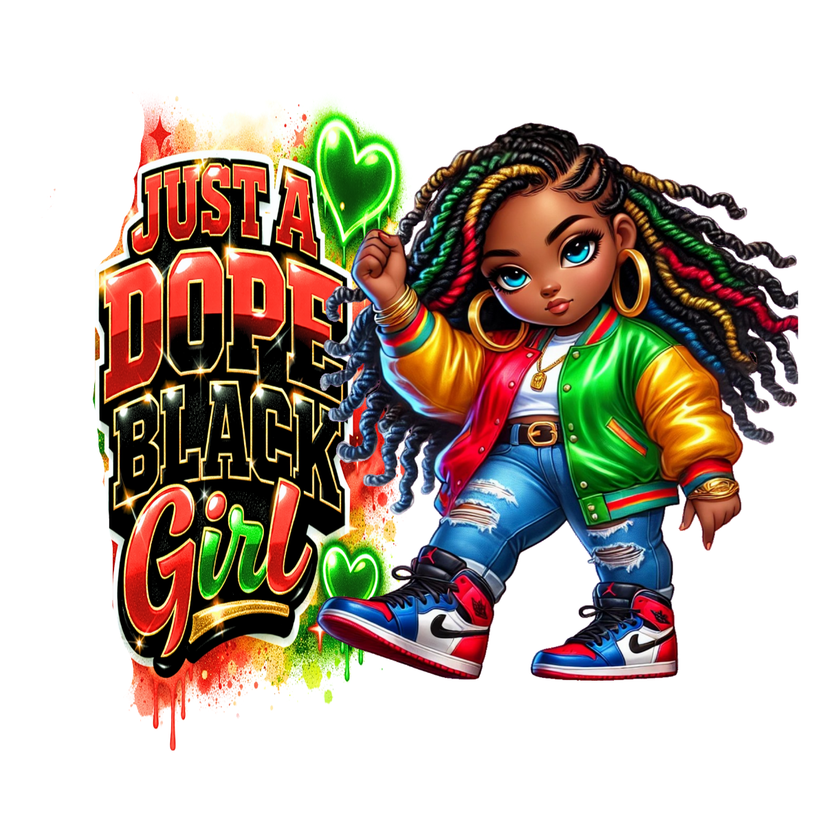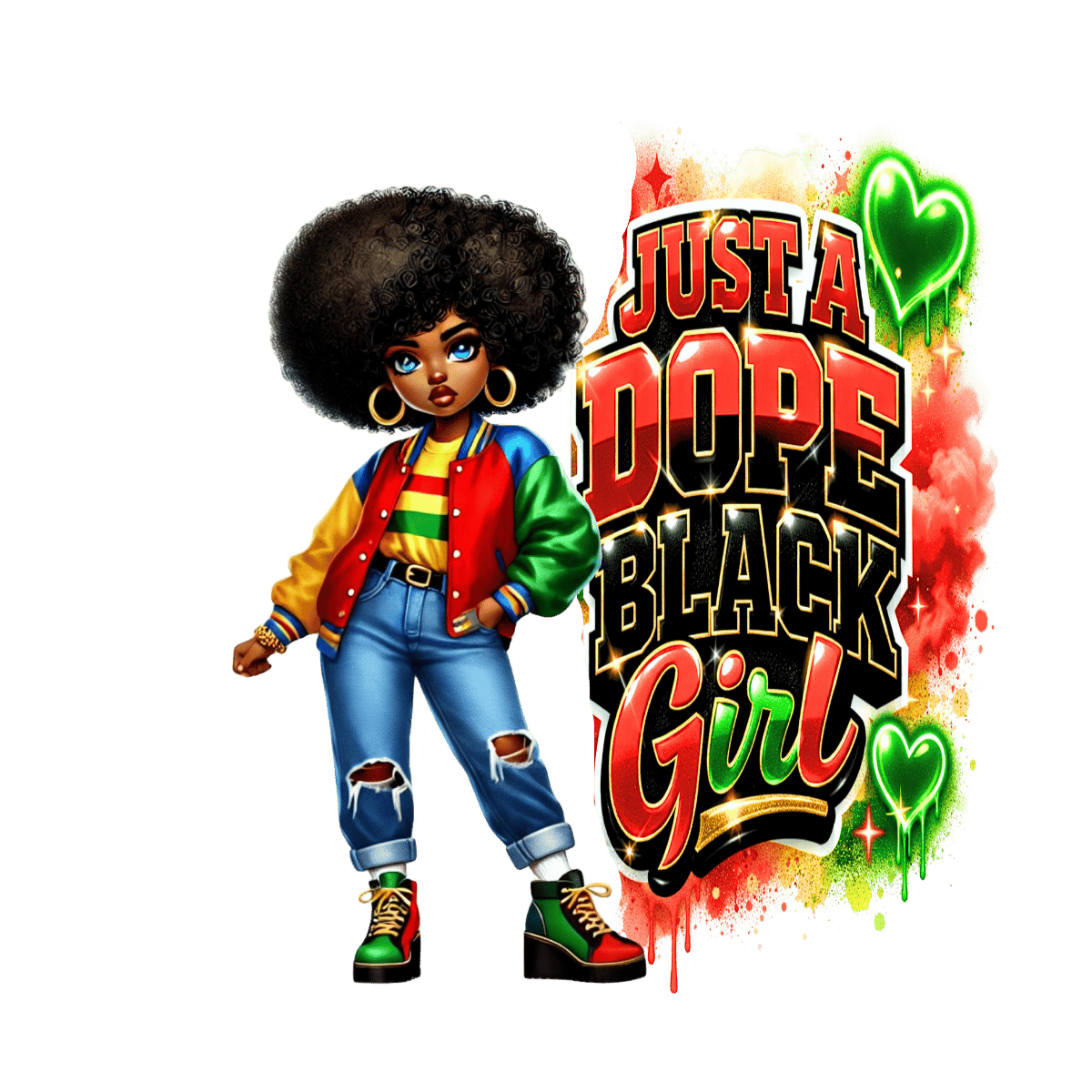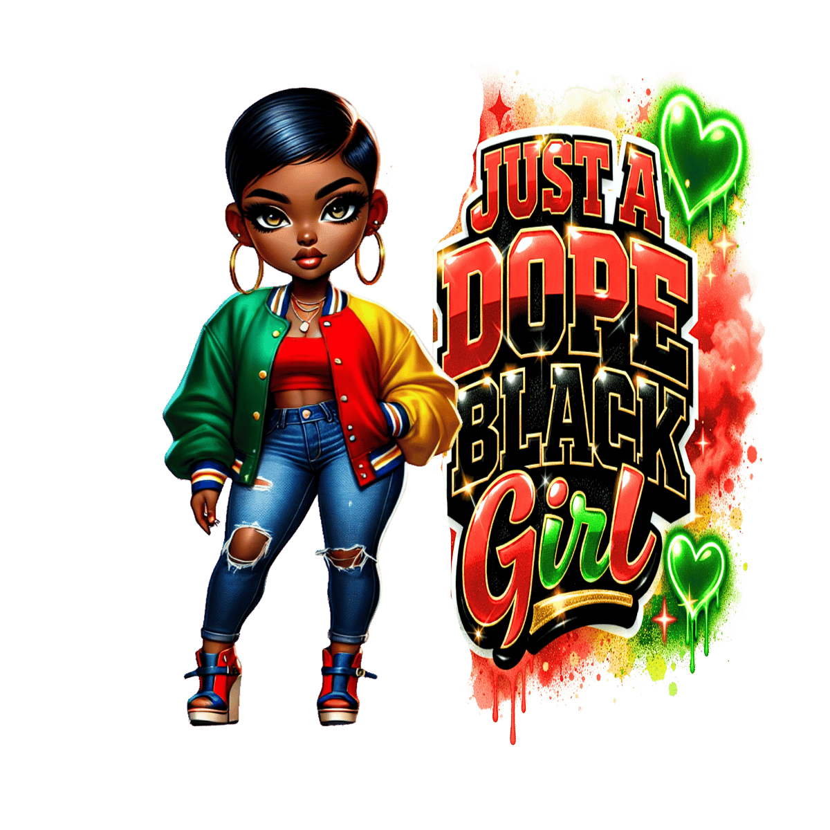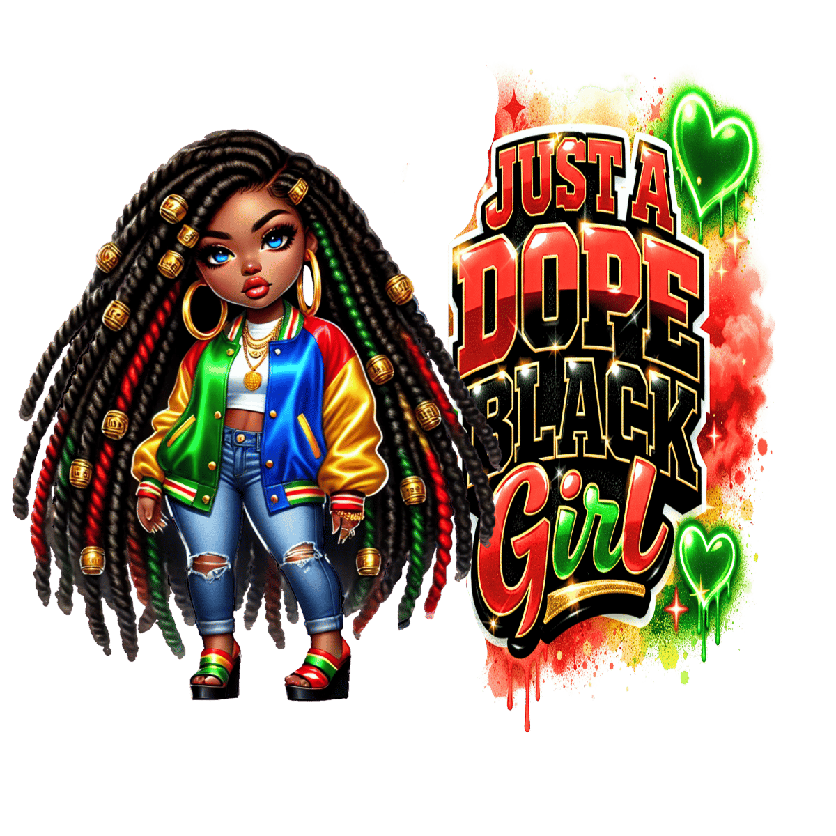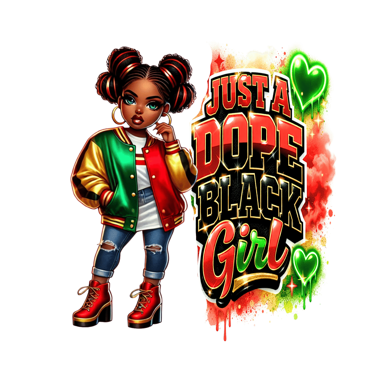 Celebrate Black History with bold style and powerful pride! This vibrant PNG features a confident African American girl with gorgeous locs, rockin' a green and yellow varsity jacket and red boots – standing beside the empowering phrase "Just a Dope Black Girl" in bold graffiti-style text. The background splashes of green and red with neon hearts add extra energy and love to the design.