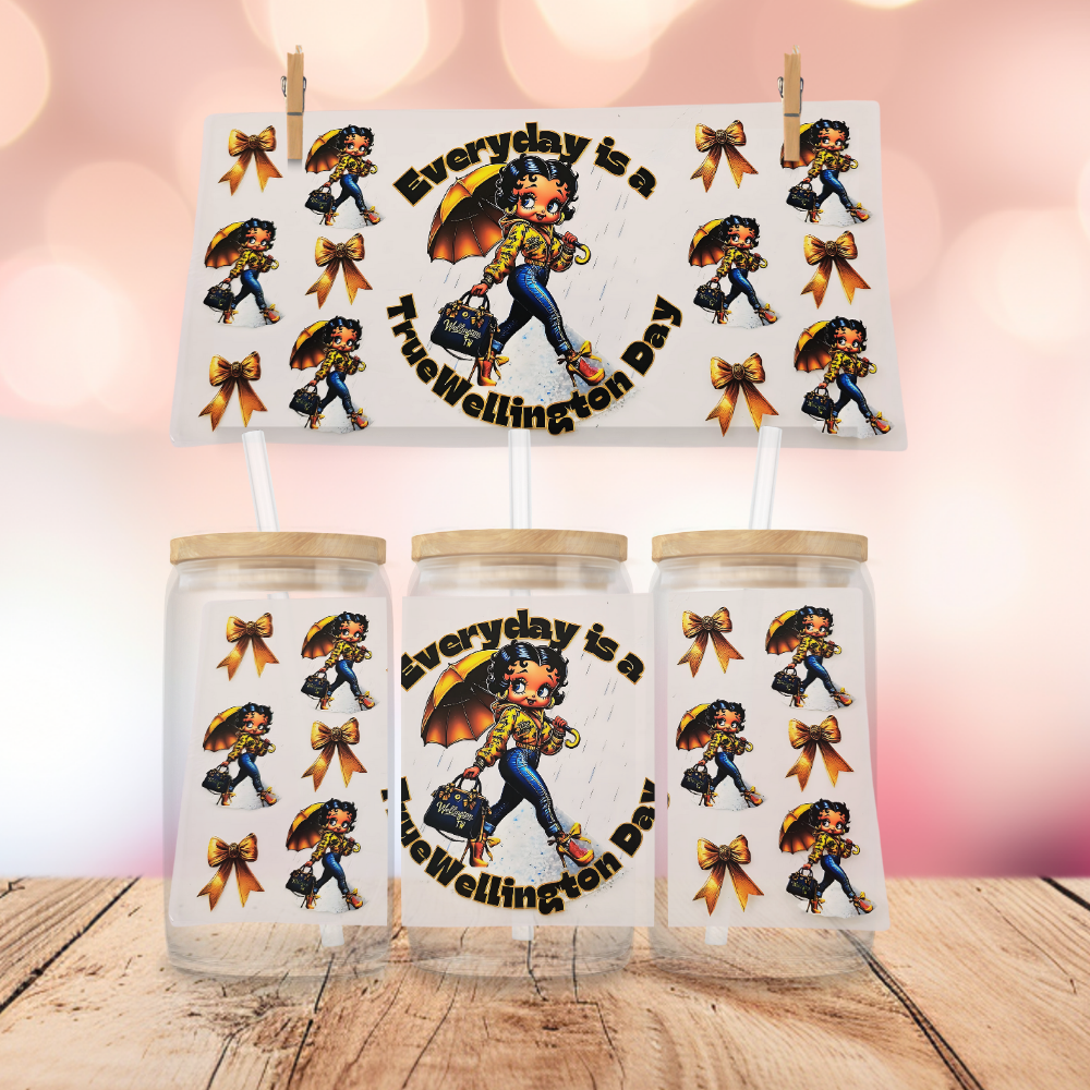 Step into elegance and boss energy with the Brown Miss B “Everyday Is a True Wellington Day” Wrap! Designed to fit 16 oz Libbey glass cans or tumblers, this design features Miss B in chic style, radiating confidence and grace. Paired with the empowering quote, this wrap celebrates the woman who owns every room she walks into—because every day is her day.