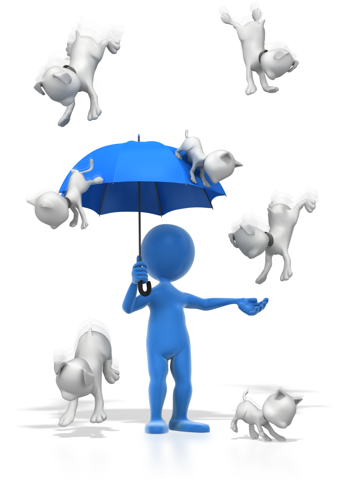 A stick figure stand under an umbrella as cats and dogs falls from above. This clip art image displays the idiom raining cats and dogs.