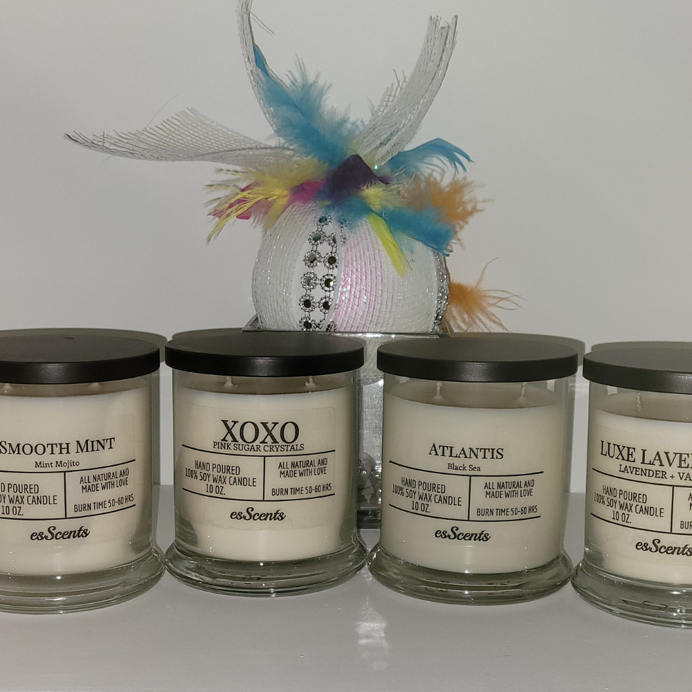 Step into the warm embrace of esScents' Soy Candles, where every flame tells a story of comfort and elegance. Crafted with eco-friendly soy wax and infused with a spectrum of bespoke scents, these candles are designed to create an atmosphere of luxury and serenity in your home. Each candle is a testament to esScents' commitment to quality and sustainability, offering a clean, long-lasting burn that captivates the senses. Whether it's the soft glow of twilight or the vibrant sparkle of a festive evening, our candles make every moment exclusive.