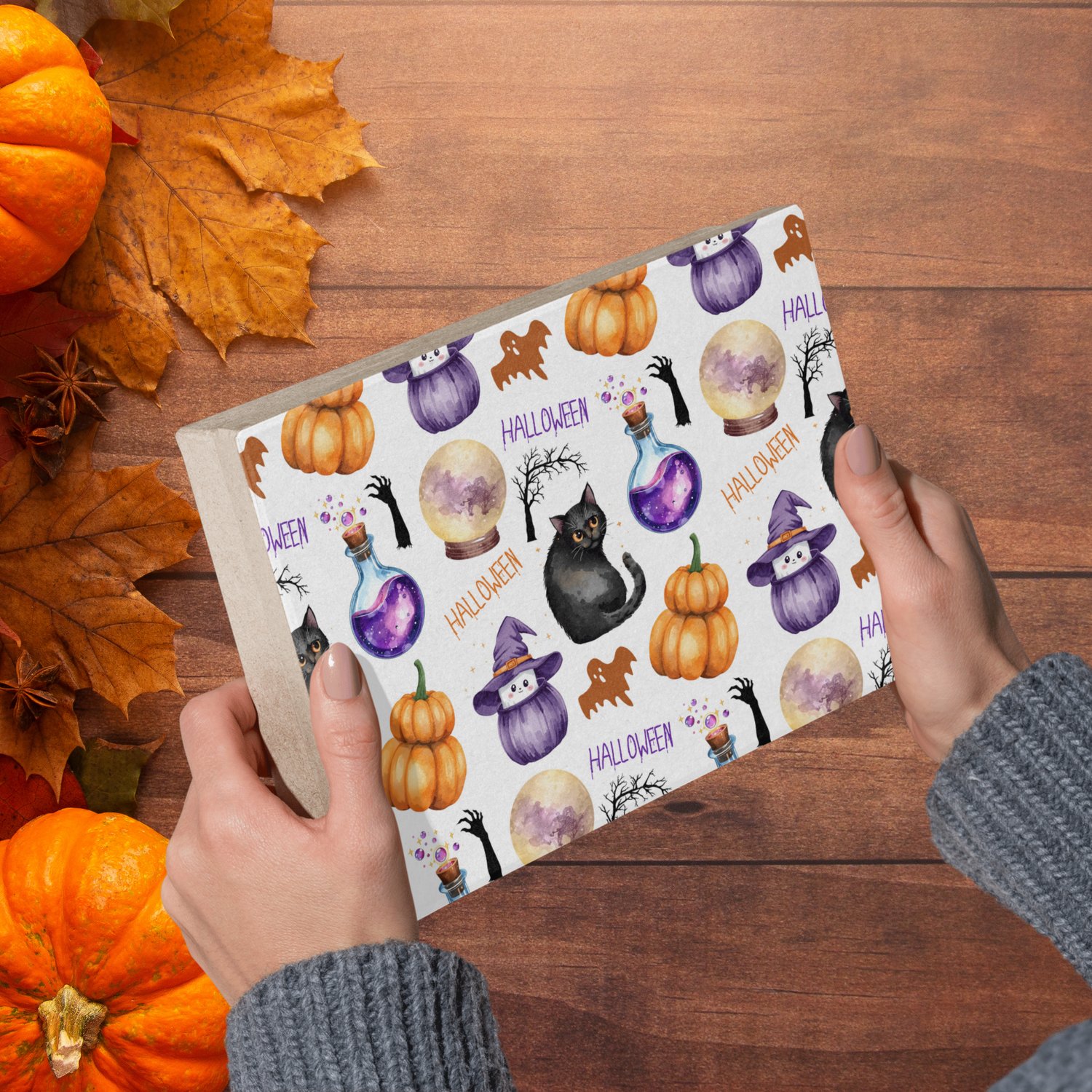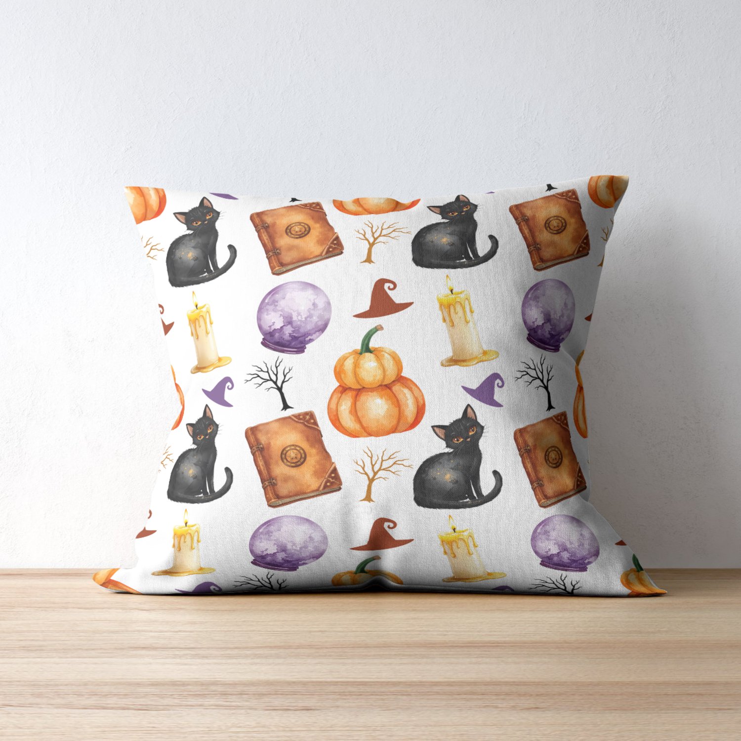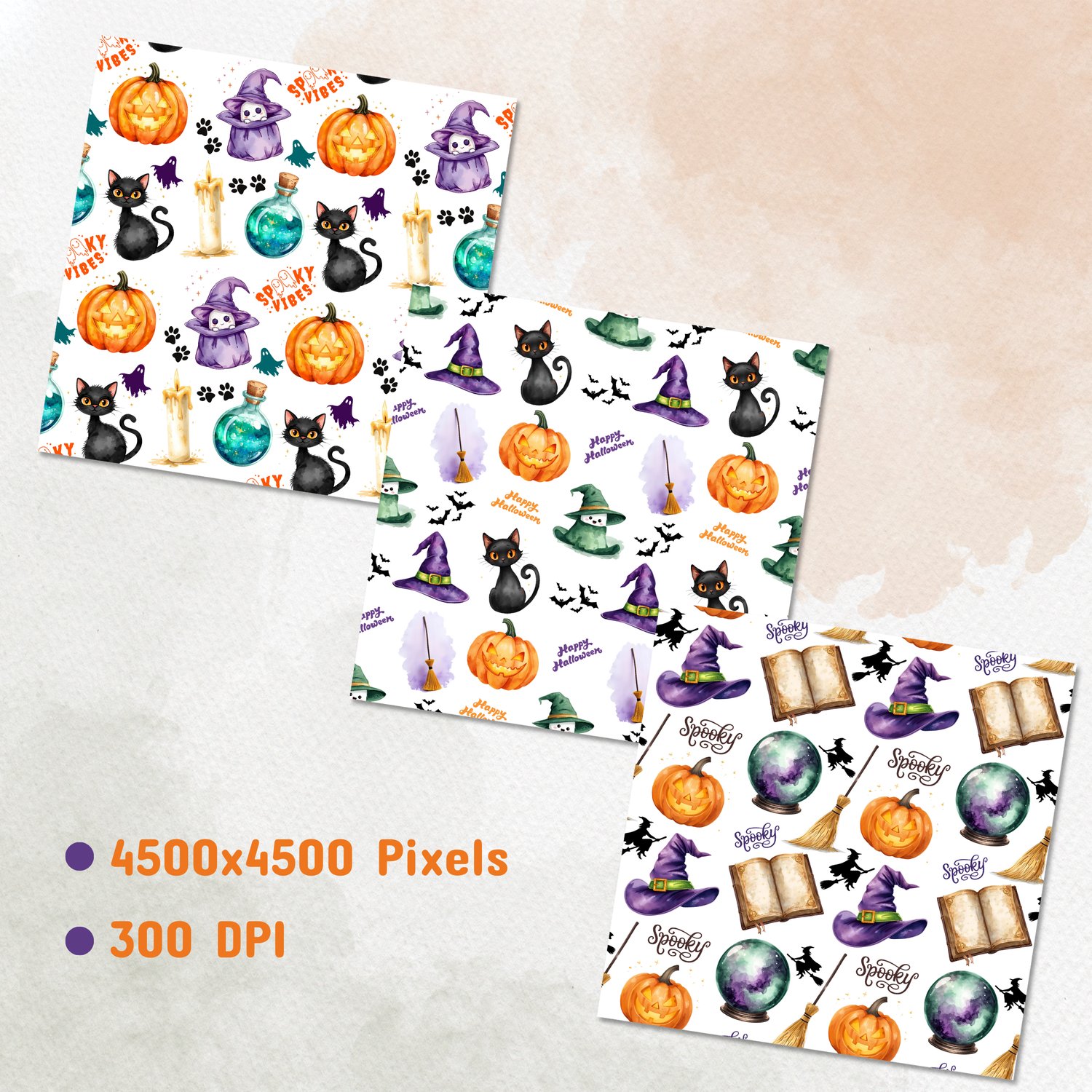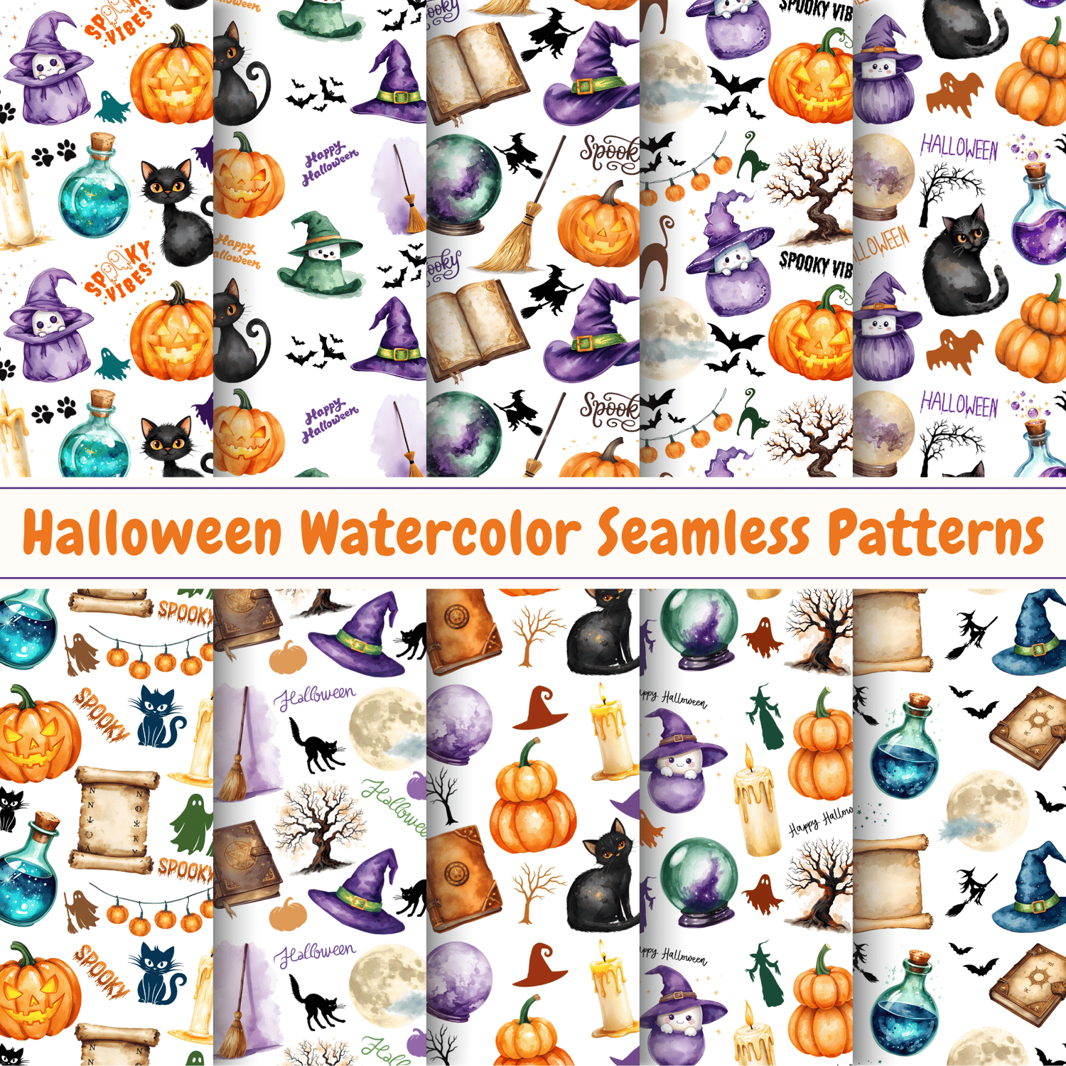 Celebrate the spooky season with this set of 10 Halloween watercolor seamless patterns. Each digital pattern features beautifully illustrated elements such as glowing carved pumpkins, witch hats, black cats, full moons, spooky trees, crystal-blue potion bottles, dripping candles, broomsticks, spell books, festive pumpkin lights, playful ghosts, and more. Designed in a cohesive watercolor style, these seamless patterns combine vibrant colors and detailed artwork to create a high-quality, ready-to-use collection for all your Halloween-themed creative ideas.