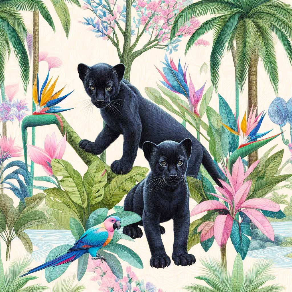 2 black panther cubs in a jungle with pink & green leaves & a tall colourful exotic plants & flowers. There is a river which ripples, & there are colourful parrots. . The background is purple & pink textured leafy patterns.