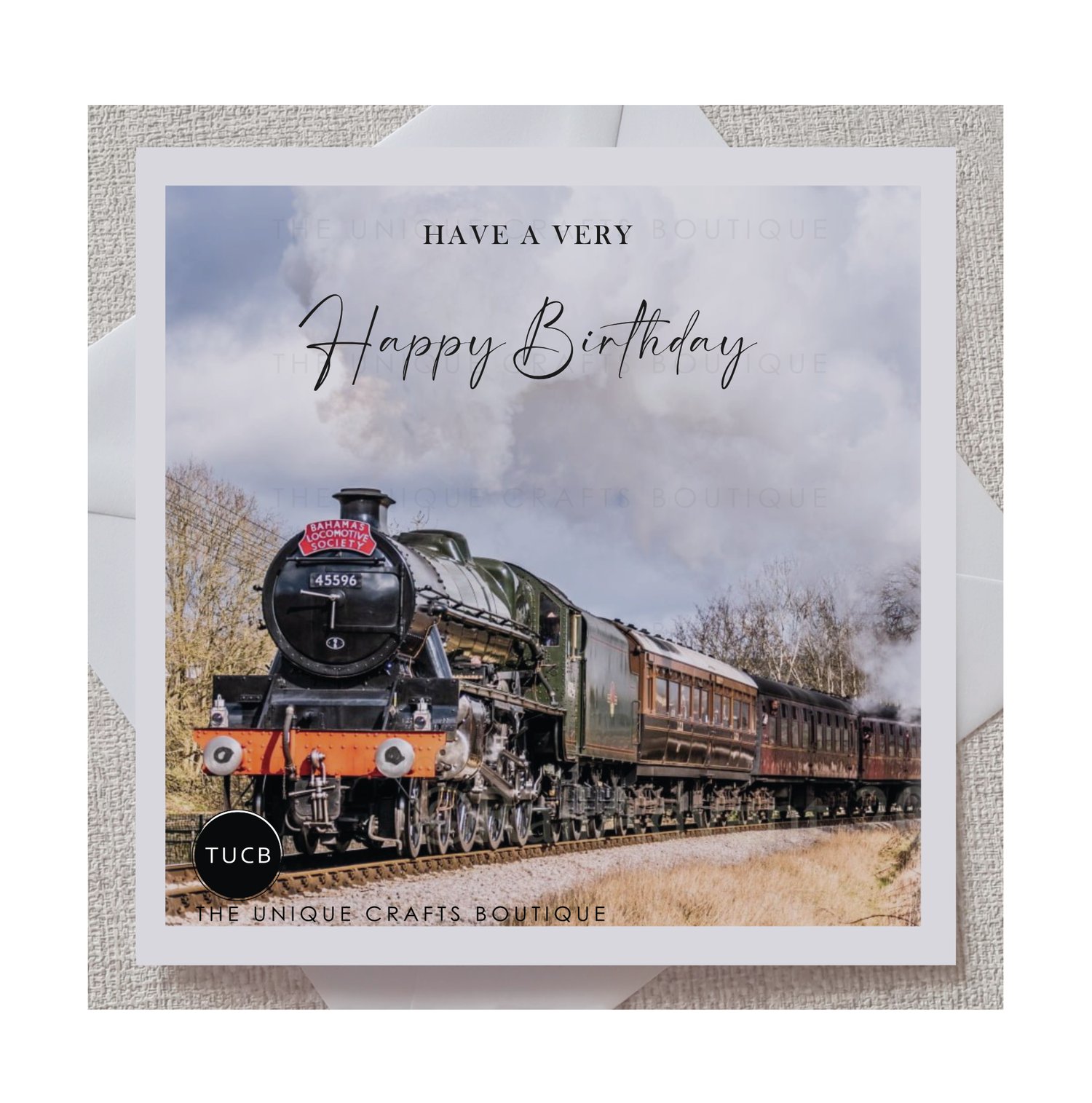 Printed with a Bahama's Locomotive Society steam train design on the front and have a very happy birthday displayed above.