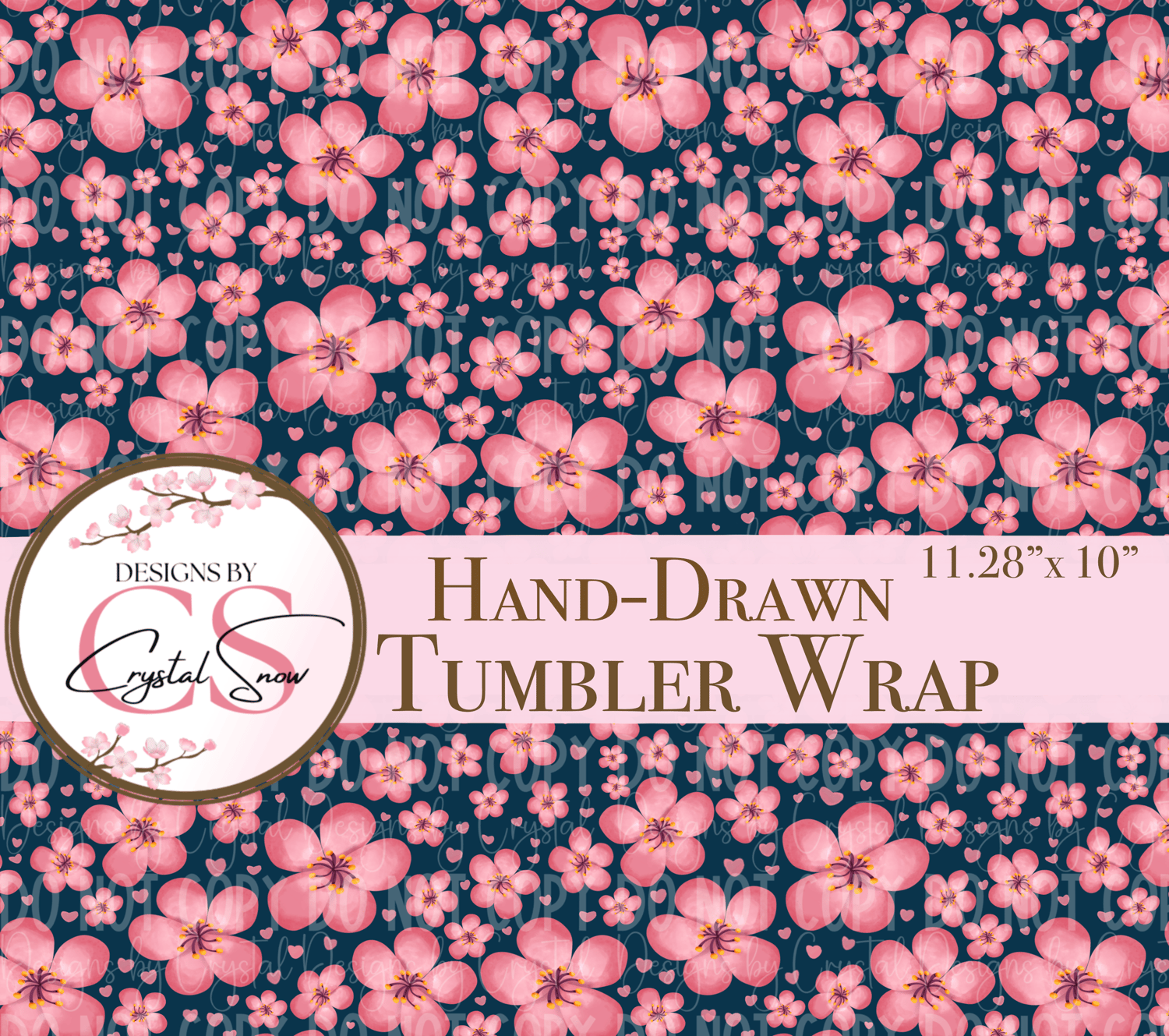 Designed with a hand-drawn cherry blossom pattern in warm pink tones and set against a deep navy background, this wrap is ideal for sublimation tumblers, drinkware gifts, Mother’s Day cups, wedding party favors, or spring shop inventory.