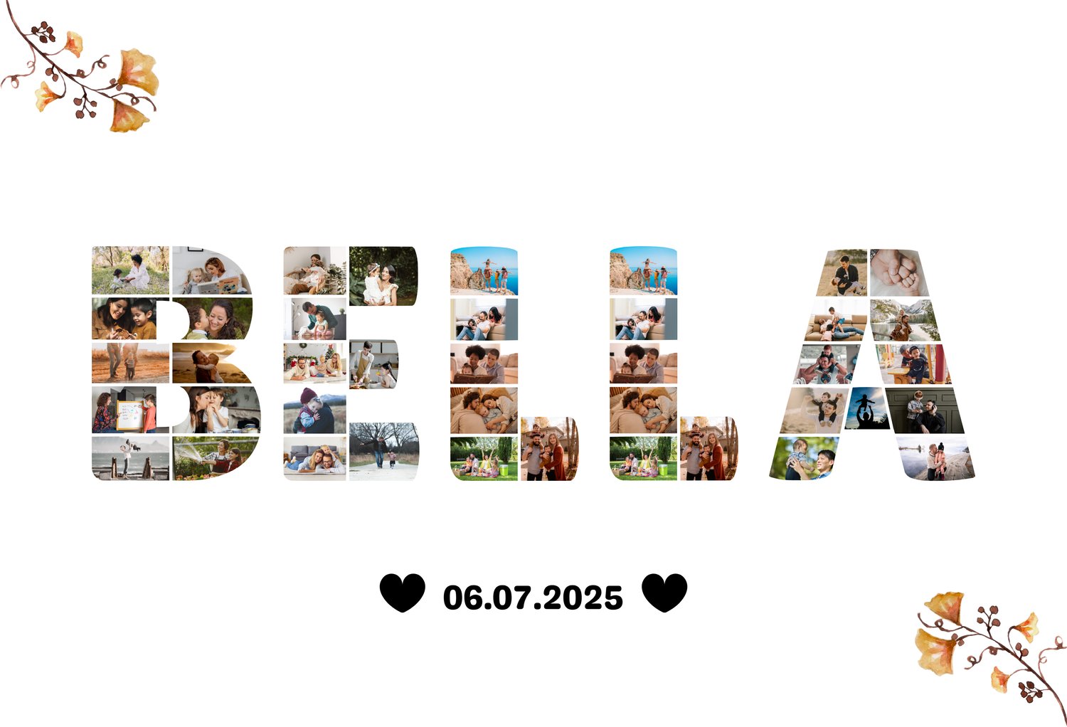 - 2 PDF Files (Canva link template + Video Tutorial Step By Step How to Design BELLA Name using Alphabet Collage Frame)