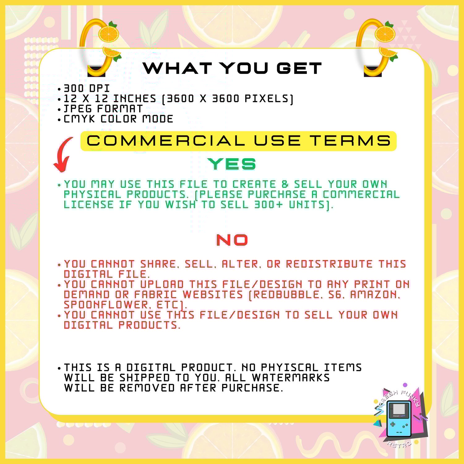 This Citrus Fruits pattern gives a fun, retro 80’s vibe that is also perfect for summer! Great for any creative projects you may have.