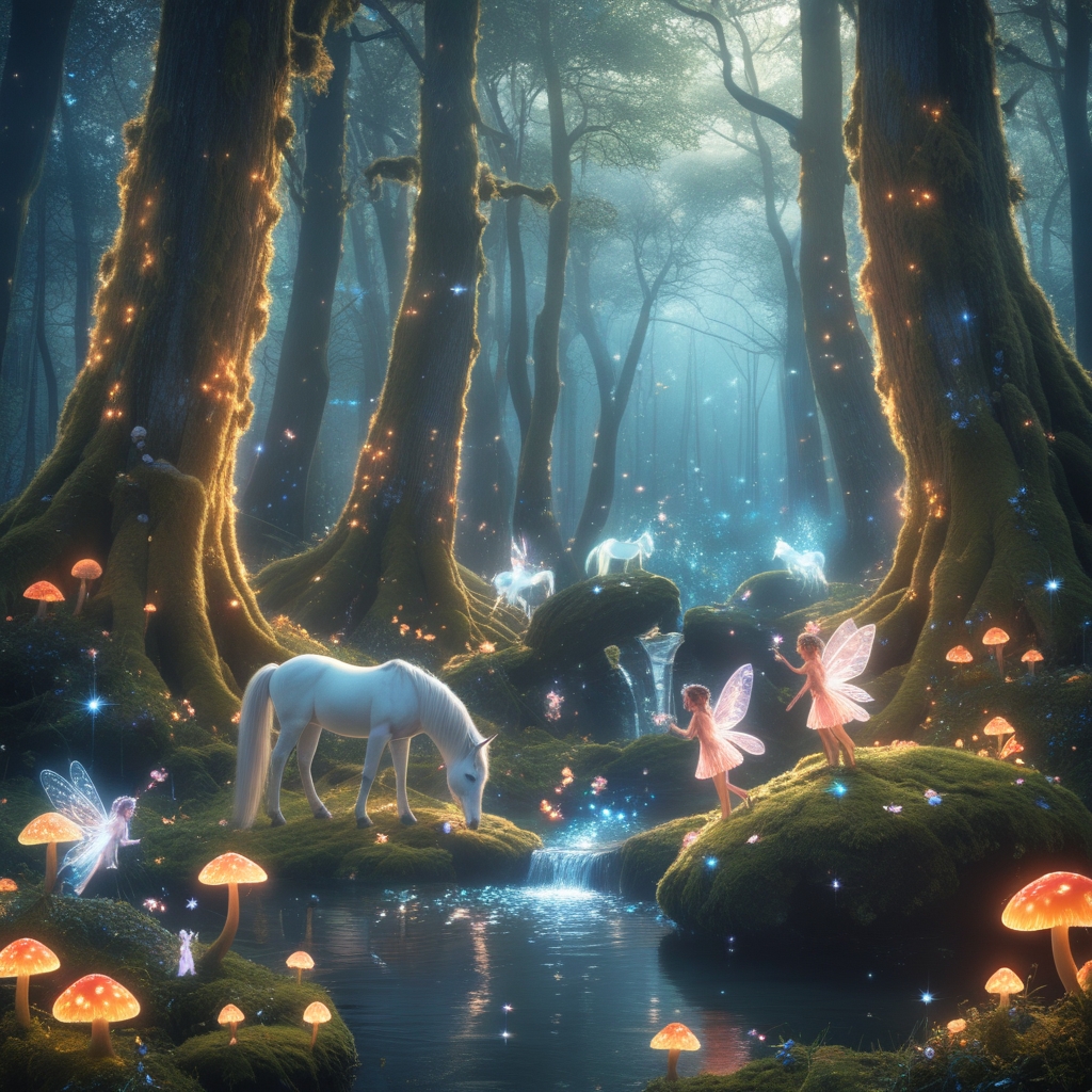"An enchanted forest filled with a soft, magical glow, where sunlight filters through towering, ancient trees covered in moss and glowing fungi. The forest is alive with mythical creatures: elegant unicorns drinking from a sparkling stream, mischievous fairies fluttering around luminous flowers, a majestic dragon perched on a mossy rock, and tiny glowing sprites dancing in the air. Mist weaves through the trees, creating a mystical atmosphere, with sparkling fireflies and shimmering magical particles throughout. The scene feels alive, magical, and serene, with rich vibrant colors and a fairytale-like ambiance."