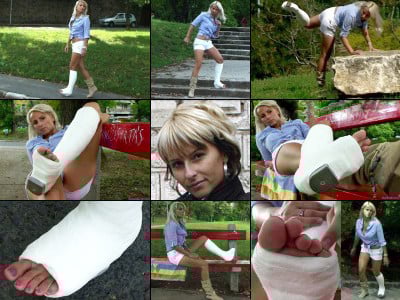 Rosalie crutches in the park on beautiful day until she finds a nice tree to lean against as she sits down in an open field to rests her casted leg and wiggle her bare toes. Some nice closeups of her perfect toes from a variety of angles. She then gets up to continue her crutching through different park locations. Finally she struggles up and keeps crutching through the park. She crutches out of the park and abandons her crutches only to return again. Rosalie is gimping outside in a single chuck while showing off her cute red polished toes on her casted foot. When she comes upon some fragrant flowers she uses them as a natural remedy between her pretty wiggling toes to eliminate cast foot stink. A nice prolonged closeup scene for this one. Then she continues her gimping in the park complete with a worms eye view scene of her toes as she hangs them off a ledge (also a long scene), digs them into the ground and wiggles them. A solid gimping clip with lots of focused closeup scenes featuring Rosalie's perfect foot and toes.