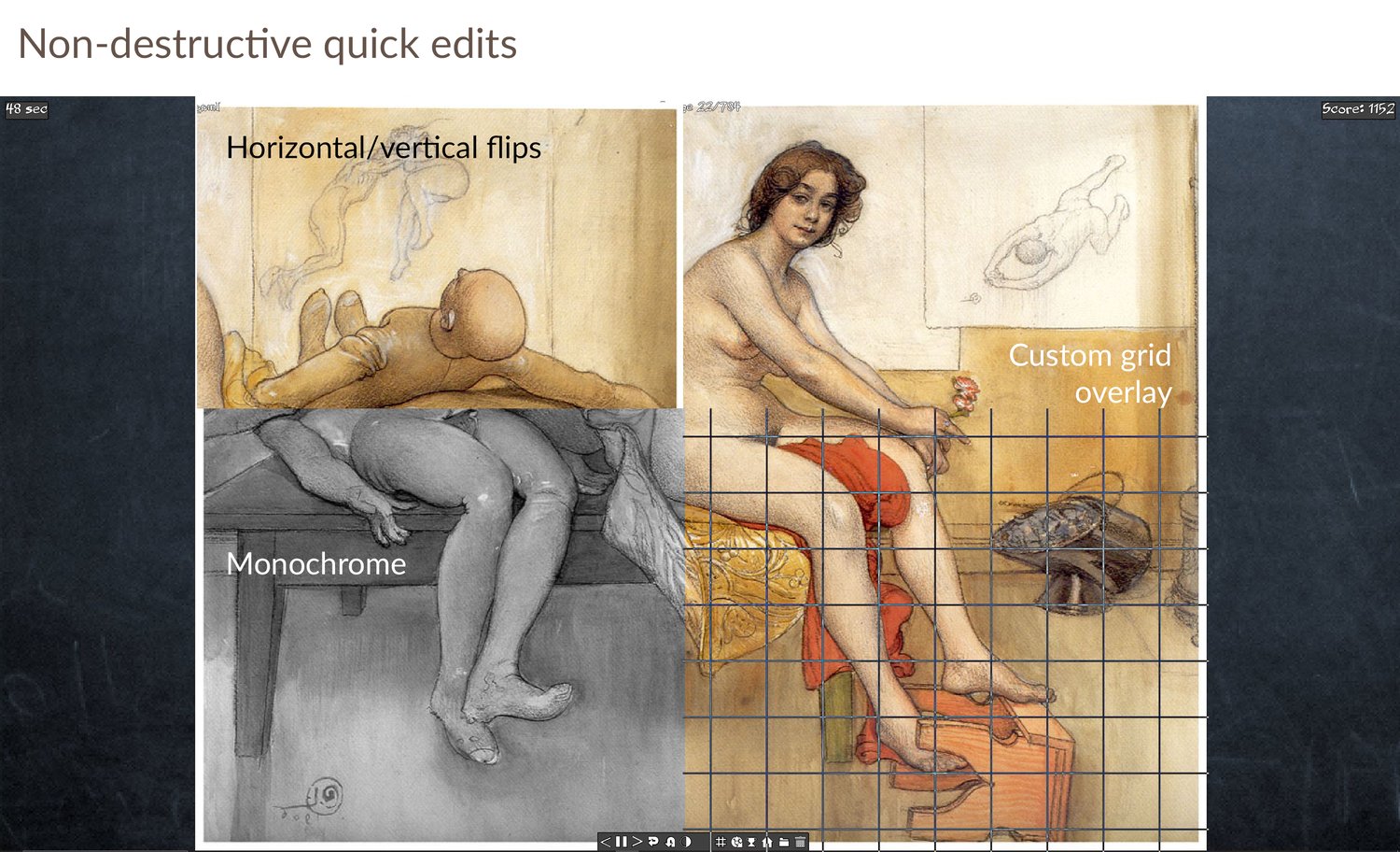 It features non destructive image editing to help your practice, ex: image flips, convert to monochrome, custom grid overlays and a daily streak system.