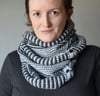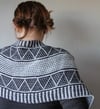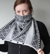 This pattern is cast on along its length; it is knit back & forth using a combination of mosaic knitting and slipped stitch patterns in garter stitch, so only one colour is worked at a time. The cowl is finished with applied button bands. The cowl can be worn with buttons closed as a long cowl or wrapped twice around the neck, or unbuttoned as a scarf.