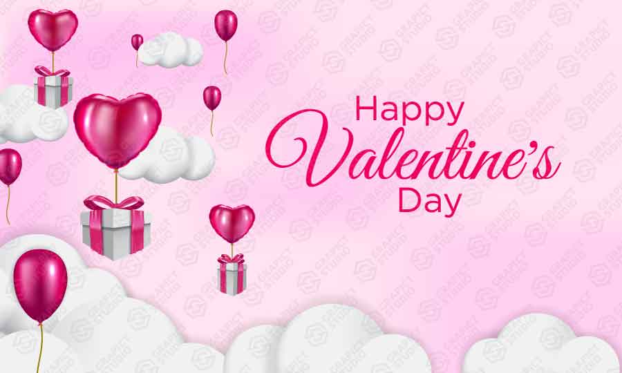 Valentine's Day background for love, 3d realistic style. Gift boxes with heart balloon floating it the sky