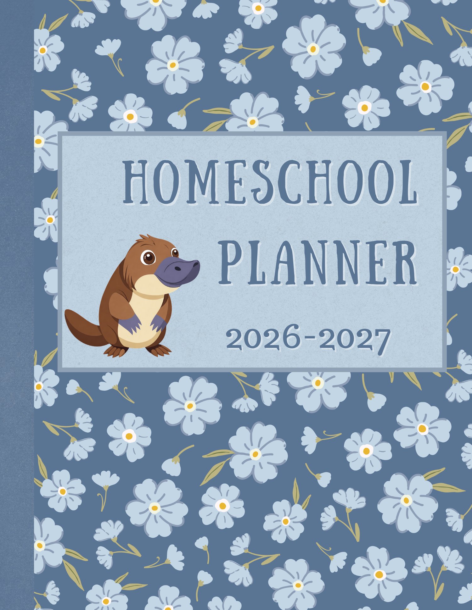 Our homeschool planner includes 2-page monthly calendars and weekly calendars for May 1, 2026, to July 31, 2027, vision statement and end of year reflection questions, vision board for each month, reminders from the Homeschool Platypus, and attendance chart.