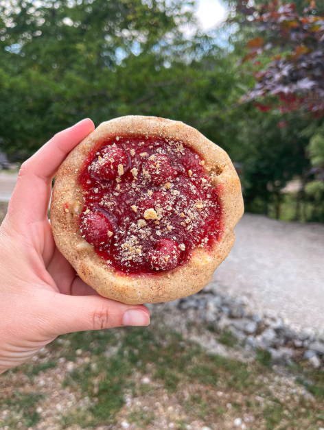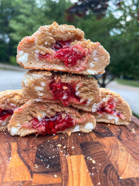 Made with a rich vanilla brown sugar dough, white chocolate chips, and a luscious cherry filling, then rolled in cinnamon sugar graham crackers for the perfect crunch.