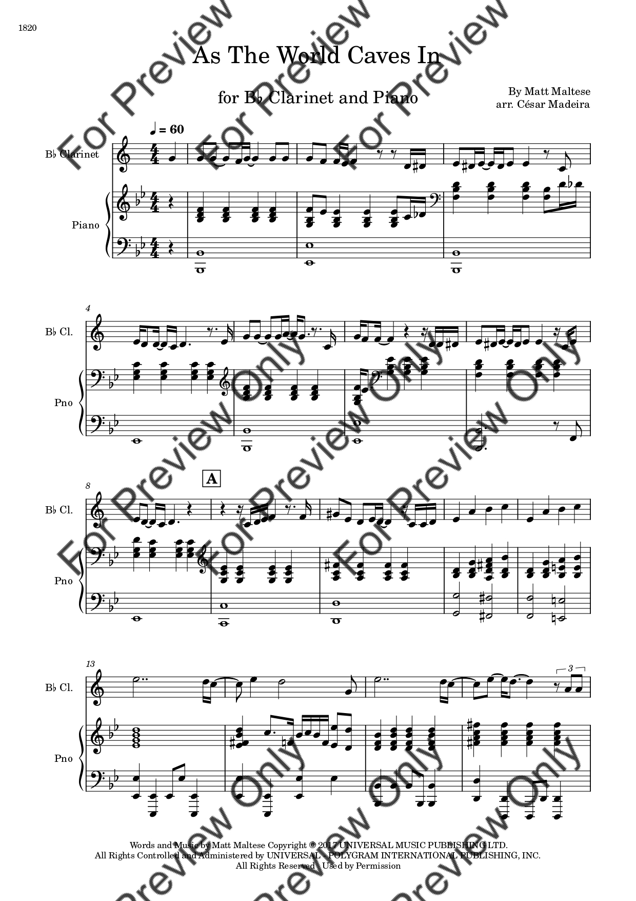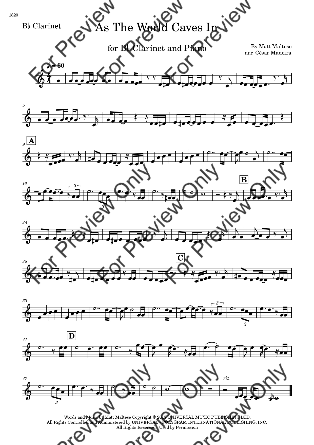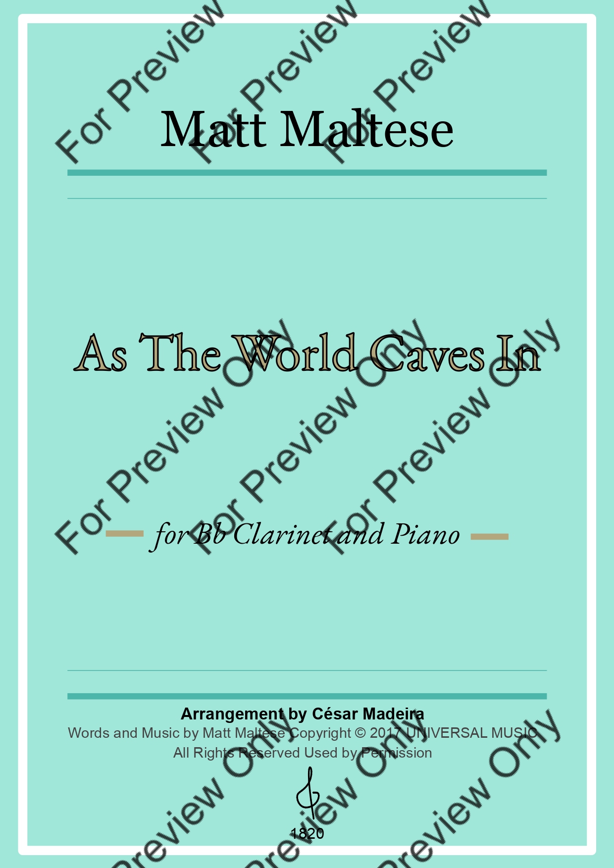As The World Caves In by Matt Maltese. Arrangement for Bb Clarinet and Piano. With Full Score and Individual Parts. Have fun!