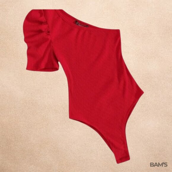 SHEIN Ribbed One-Shoulder Puffy Red Bodysuit | Size S