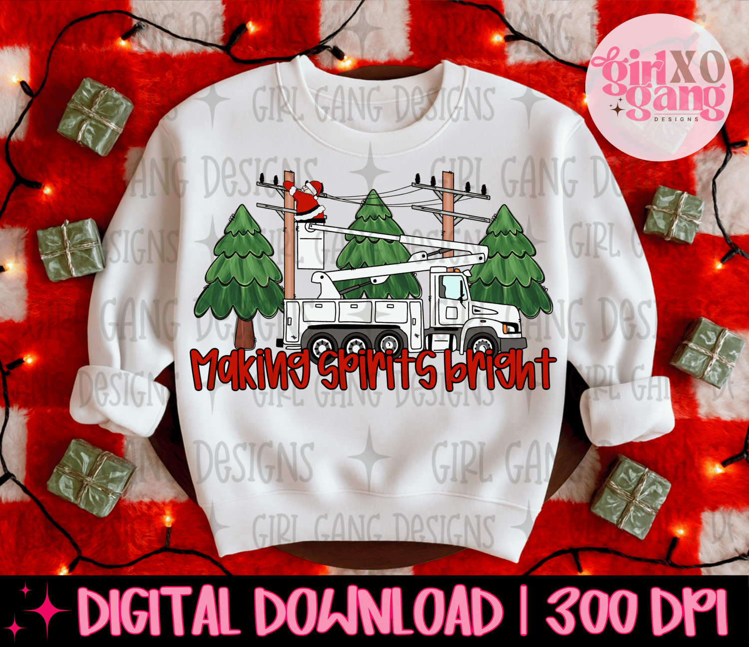 Making spirits bright bucket truck png, blue collar Santa png, bucket truck doodle png, Christmas Santa Claus bucket truck png,