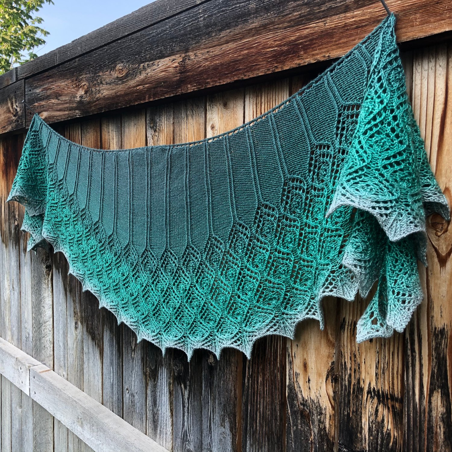 19 sts and 37 rows = 4 in/10 cm, in stockinette stitch after blocking. Gauge is not critical for this shawl but may affect yardage needed to complete the shawl. The pattern uses 484 yards/443 meters | 795 yards/727 meters at gauge.