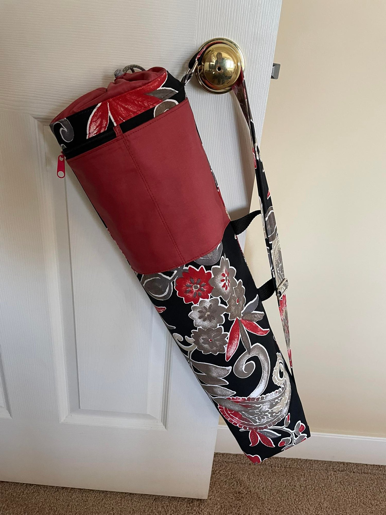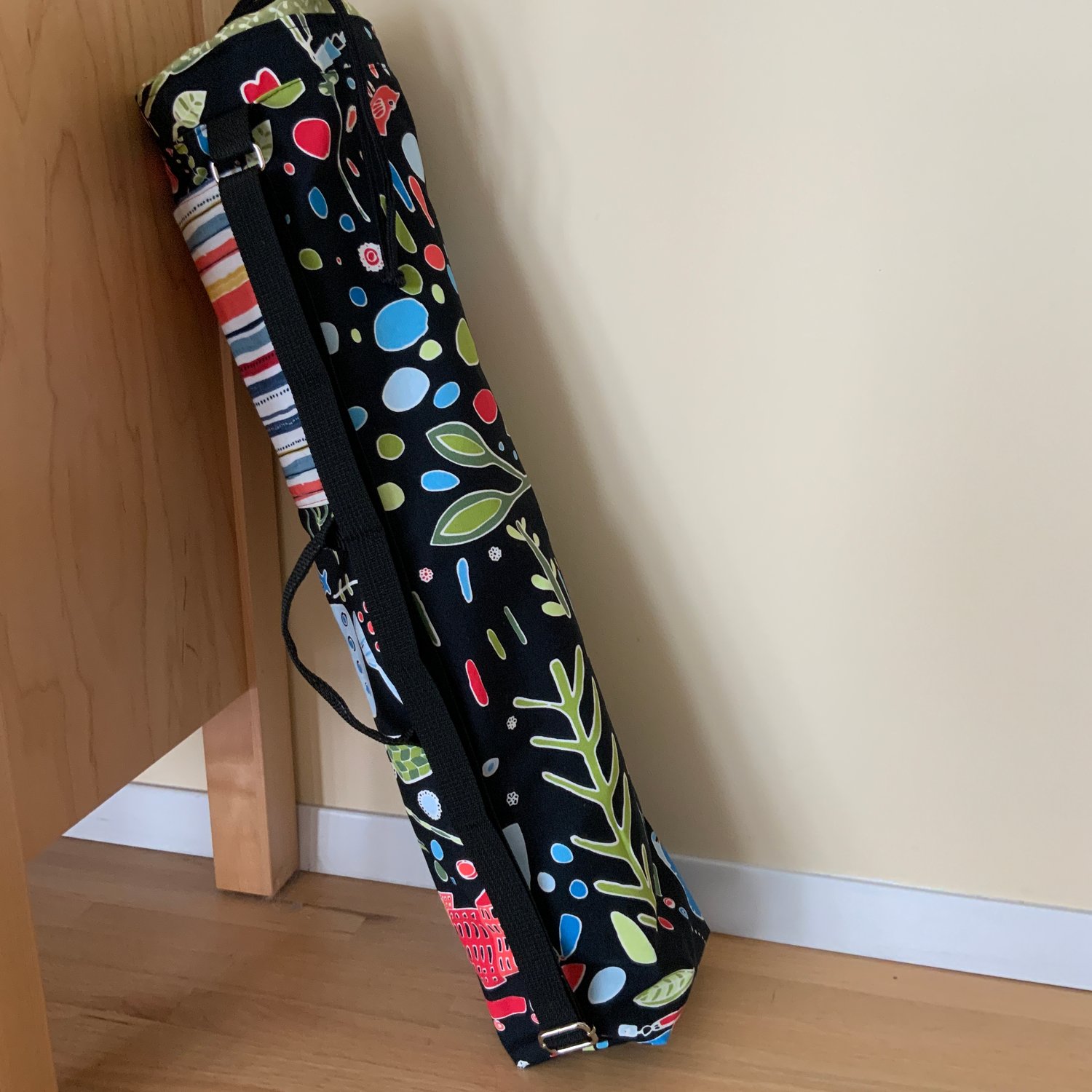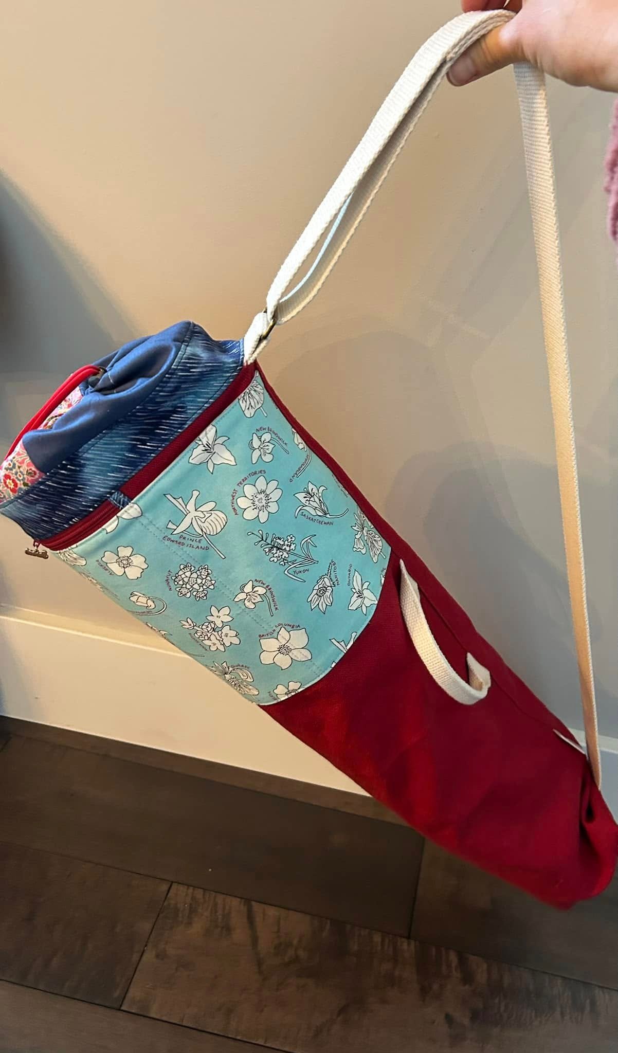 YOGA-LONG is a pattern for a drawstring bag that holds a standard 24” x 68” x ¼” (61 x 173 x 0.6 cm) yoga mat.